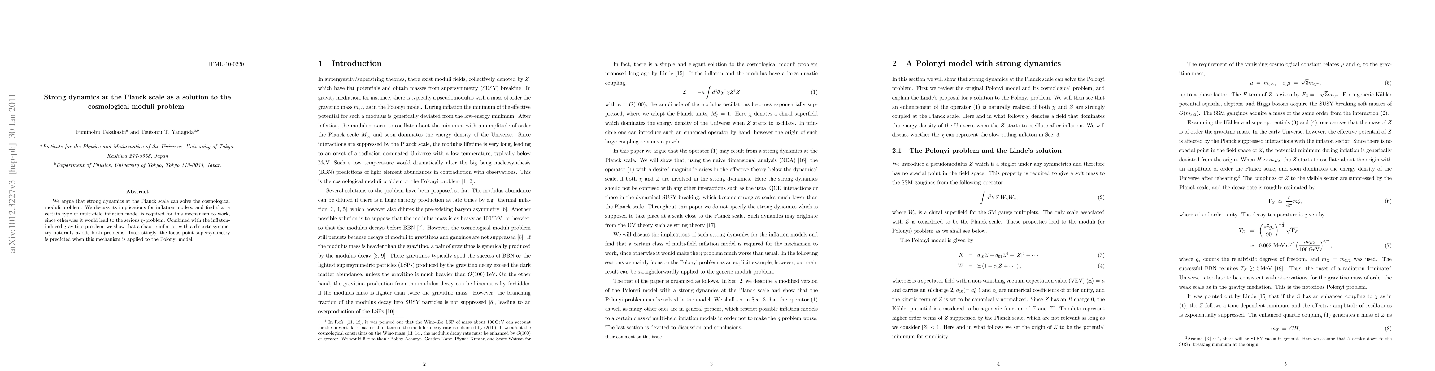 We argue that strong dynamics at the Planck scale can solve the cosmological moduli problem. We discuss its implications for inflation models, and find that a certain type of multi-field inflation model is required for this mechanism to work, since otherwise it would lead to the serious eta-problem. Combined with the inflaton-induced gravitino problem, we show that a chaotic inflation with a discrete symmetry naturally avoids both problems. Interestingly, the focus point supersymmetry is predicted when this mechanism is applied to the Polonyi model.