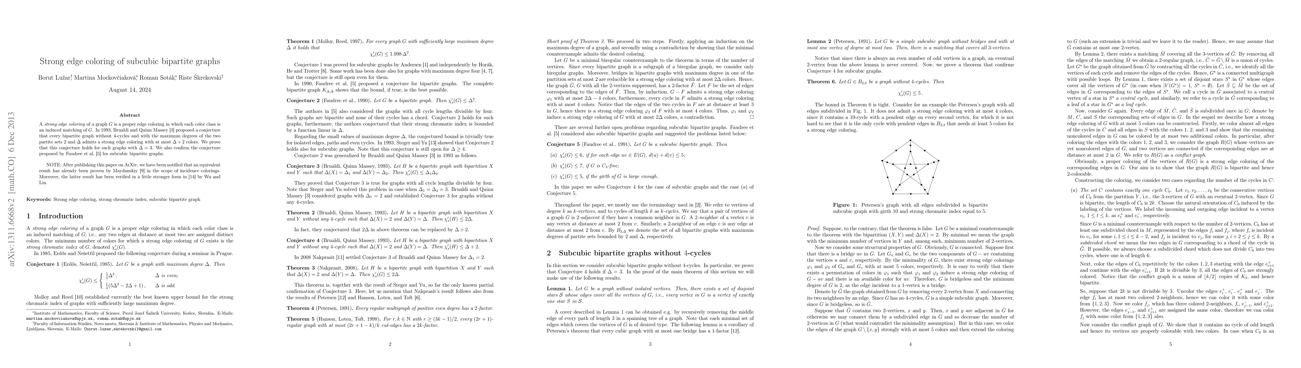 The paper proves that bipartite subcubic graphs without 4-cycles, where one partite set has a maximum degree of 2 and the other has a maximum degree of 3, can be strongly edge colored using at most 5 colors. Additionally, it confirms the conjecture for subcubic bipartite graphs regarding strong edge coloring.