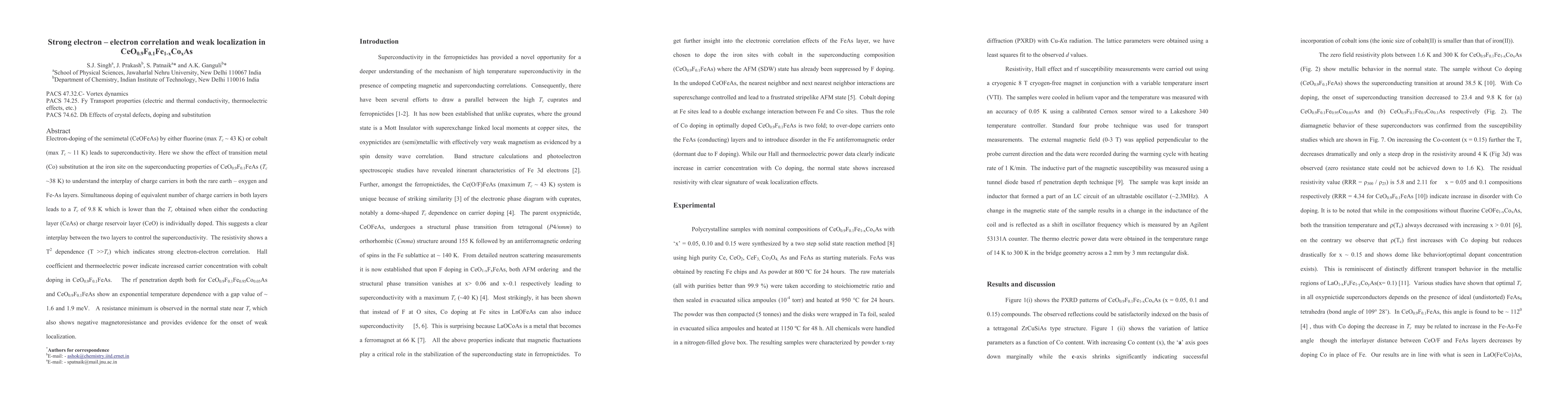 Electron-doping of the semimetal (CeOFeAs) by either fluorine (max Tc ~ 43 K)or cobalt (max Tc ~ 11 K) leads to superconductivity. Here we show the effect of transition metal (Co) substitution at the iron site on the superconducting properties of CeO0.9F0.1FeAs (Tc ~38 K)to understand the interplay of charge carriers in both the rare earth-oxygen and Fe-As layers. Simultaneous doping of equivalent number of charge carriers in both layers leads to a Tc of 9.8 K which is lower than the Tc obtained when either the conducting layer (CeAs) or charge reservoir layer (CeO) is individually doped. This suggests a clear interplay between the two layers to control the superconductivity. The resistivity shows a T2 dependence (T >>Tc) which indicates strong electron-electron correlation. Hall coefficient and thermoelectric power indicate increased carrier concentration with cobalt doping in CeO0.9F0.1FeAs. The rf penetration depth both for CeO0.9F0.1Fe0.95Co0.05As and CeO0.9F0.1FeAs show an exponential temperature dependence with a gap value of ~ 1.6 and 1.9 meV. A resistance minimum is observed in the normal state near Tc which also shows negative magnetoresistance and provides evidence for the onset of weak localization.