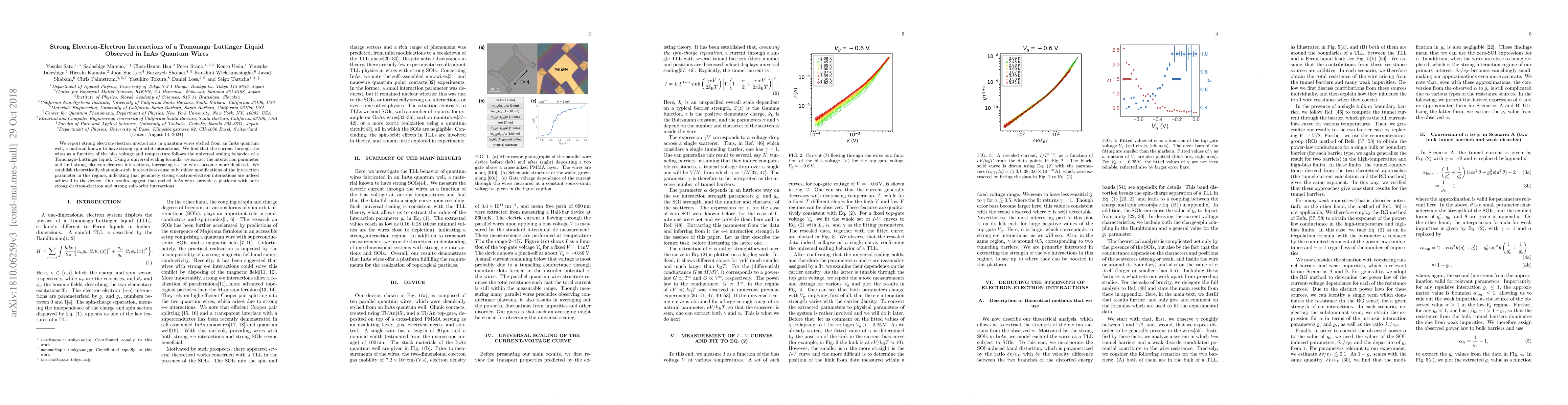 We report strong electron-electron interactions in quantum wires etched from an InAs quantum well, a material known to have strong spin-orbit interactions. We find that the current through the wires as a function of the bias voltage and temperature follows the universal scaling behavior of a Tomonaga--Luttinger liquid. Using a universal scaling formula, we extract the interaction parameter and find strong electron-electron interactions, increasing as the wires become more depleted. We establish theoretically that spin-orbit interactions cause only minor modifications of the interaction parameter in this regime, indicating that genuinely strong electron-electron interactions are indeed achieved in the device. Our results suggest that etched InAs wires provide a platform with both strong electron-electron and strong spin-orbit interactions.