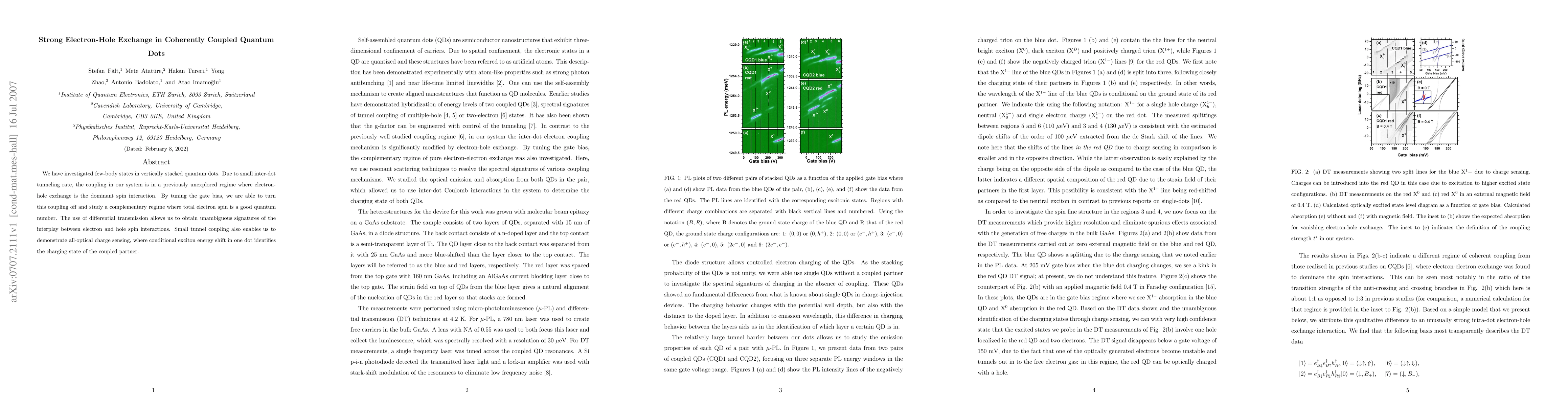 We have investigated few-body states in vertically stacked quantum dots. Due to small inter-dot tunneling rate, the coupling in our system is in a previously unexplored regime where electron-hole exchange is the dominant spin interaction. By tuning the gate bias, we are able to turn this coupling off and study a complementary regime where total electron spin is a good quantum number. The use of differential transmission allows us to obtain unambiguous signatures of the interplay between electron and hole spin interactions. Small tunnel coupling also enables us to demonstrate all-optical charge sensing, where conditional exciton energy shift in one dot identifies the charging state of the coupled partner.