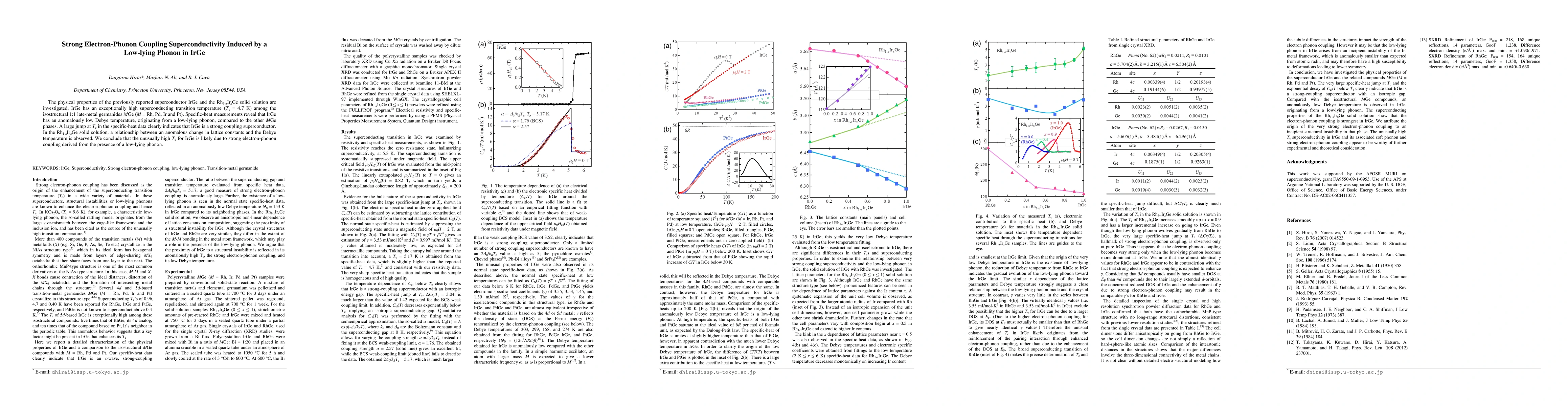 The physical properties of the previously reported superconductor IrGe and the Rh1-xIrxGe solid solution are investigated. IrGe has an exceptionally high superconducting transition temperature (Tc = 4.7 K) among the isostructural 1:1 late-metal germanides MGe (M = Rh, Pd, Ir and Pt). Specific-heat measurements reveal that IrGe has an anomalously low Debye temperature, originating from a low-lying phonon, compared to the other MGe phases. A large jump at Tc in the specific-heat data clearly indicates that IrGe is a strong coupling superconductor. In the Rh1-xIrxGe solid solution, a relationship between an anomalous change in lattice constants and the Debye temperature is observed. We conclude that the unusually high Tc for IrGe is likely due to strong electron-phonon coupling derived from the presence of a low-lying phonon.