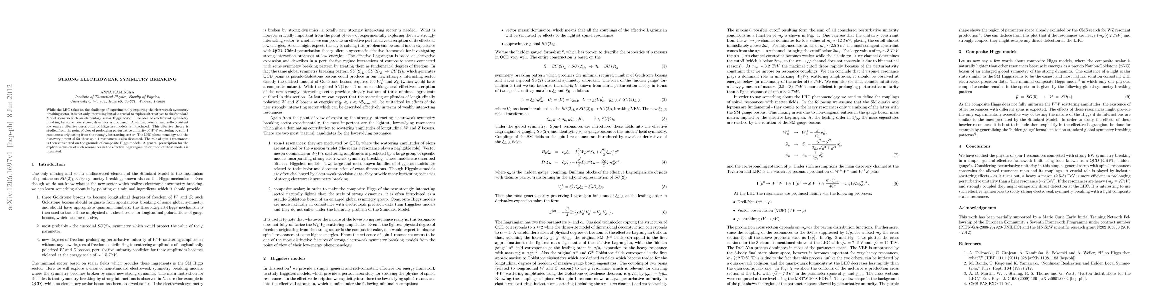 This paper explores alternatives to the Standard Model Higgs for electroweak symmetry breaking, proposing a low-energy effective description of Higgsless models. It investigates spin-1 resonances from strong dynamics to maintain perturbative unitarity and discusses their phenomenology and discovery potential at the LHC, alongside their role in composite Higgs models.