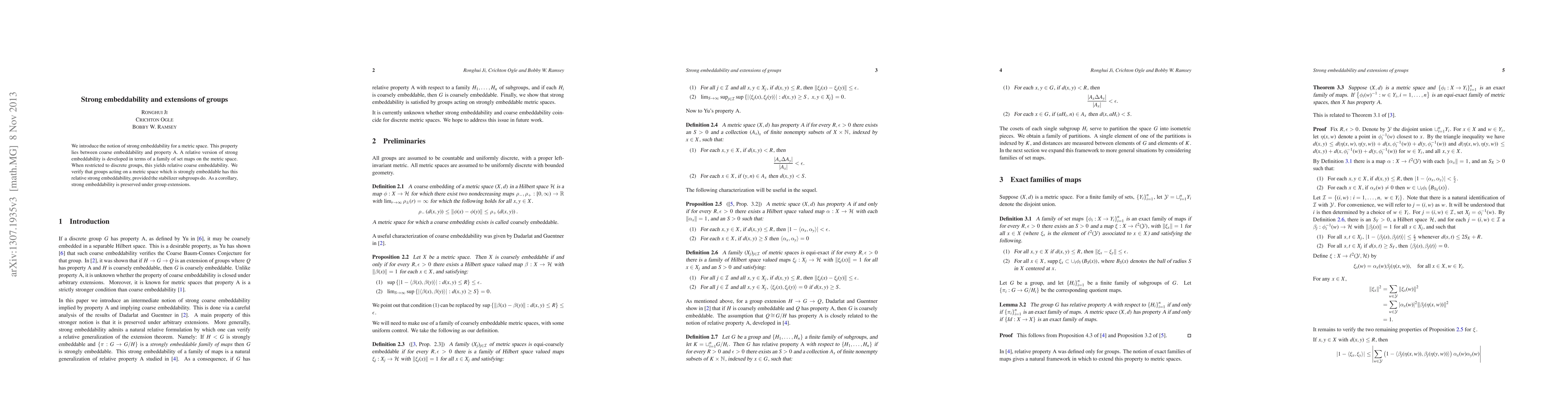 This paper introduces the concept of strong embeddability for metric spaces, which lies between coarse embeddability and property A. It also develops a relative version for groups, showing that groups acting on strongly embeddable spaces maintain this property under extensions, provided their stabilizer subgroups do.
