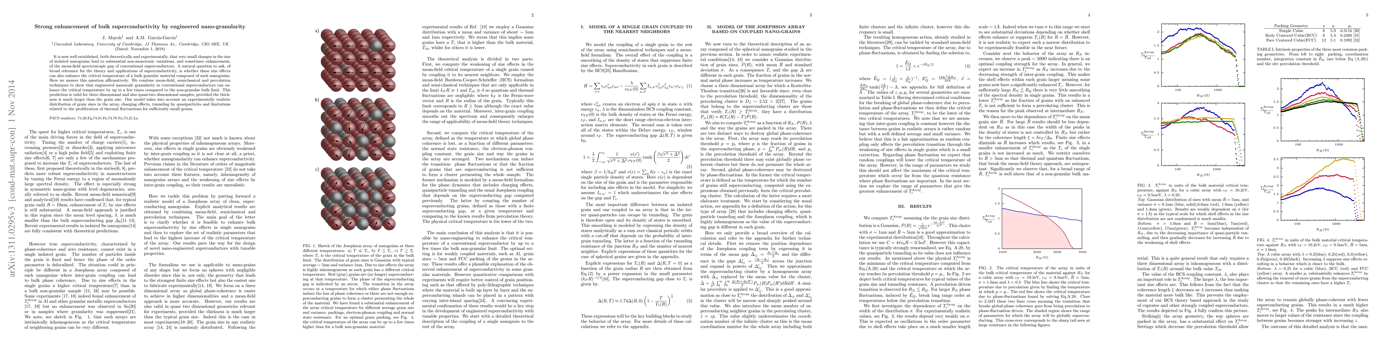 It is now well established, both theoretically and experimentally, that very small changes in the size of isolated nanograins lead to substantial nonmonotonic variations, and sometimes enhancement, of the mean-field spectroscopic gap of conventional superconductors. A natural question to ask, of broad relevance for the theory and applications of superconductivity, is whether these size effects can also enhance the critical temperature of a bulk granular material composed of such nanograins. Here we answer this question affirmatively. We combine mean-field, semiclassical, and percolation techniques to show that engineered nanoscale granularity in conventional superconductors can enhance the critical temperature by up to a few times compared to the nongranular bulk limit. This prediction is valid for three-dimensional and also quasi-two-dimensional samples, provided the thickness is much larger than the grain size. Our model takes into account an experimentally realistic distribution of grain sizes in the array, charging effects, tunnelling by quasiparticles, and limitations related to the proliferation of thermal fluctuations for sufficiently small grains.
