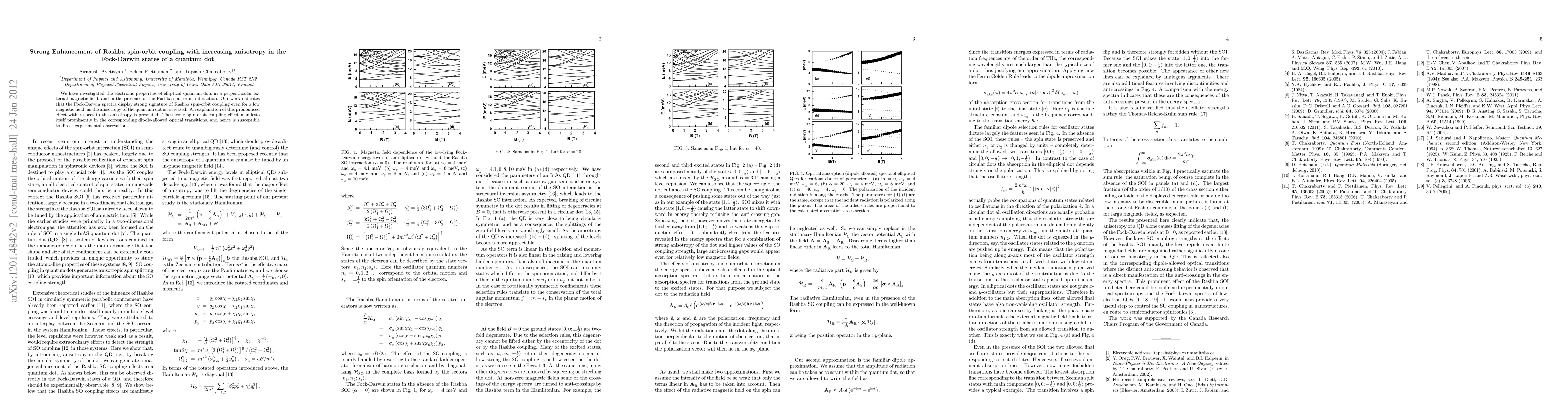 This paper investigates the electronic properties of elliptical quantum dots under a perpendicular magnetic field, revealing that increased anisotropy enhances Rashba spin-orbit coupling in the Fock-Darwin spectra, even at low magnetic fields. The pronounced effect is explained in terms of quantum dot anisotropy and is observable in dipole-allowed optical transitions.