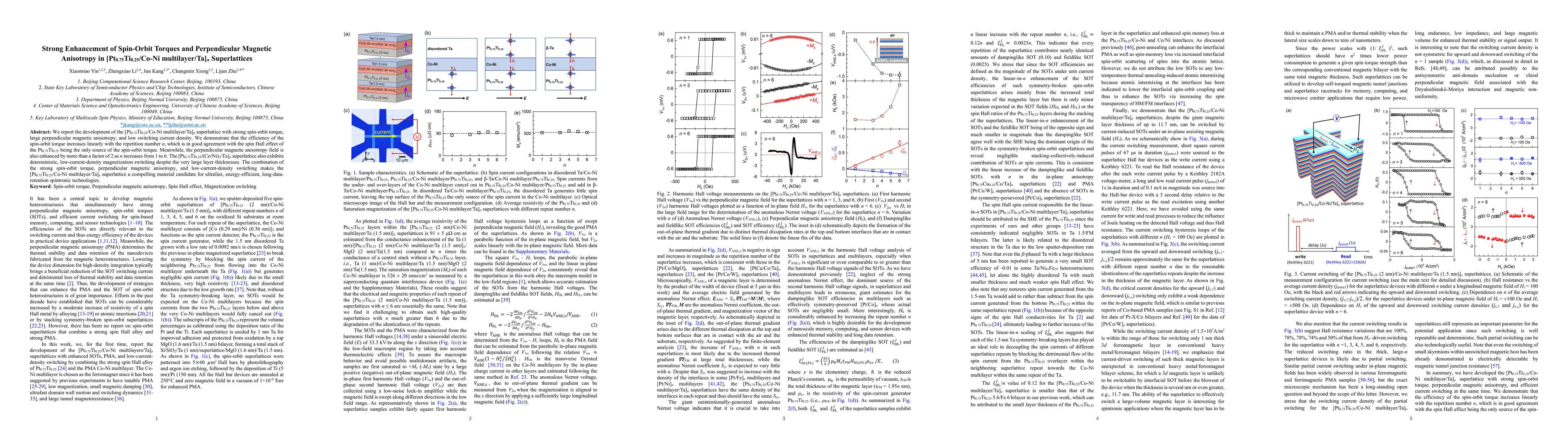 We report the development of the [Pt0.75Ti0.25/Co-Ni multilayer/Ta]n superlattice with strong spin-orbit torque, large perpendicular magnetic anisotropy, and low switching current density. We demonstrate that the efficiency of the spin-orbit torque increases linearly with the repetition number n, which is in good agreement with the spin Hall effect of the Pt0.75Ti0.25 being the only source of the spin-orbit torque. Meanwhile, the perpendicular magnetic anisotropy field is also enhanced by more than a factor of 2 as n increases from 1 to 6. The [Pt0.75Ti0.25/(Co/Ni)3/Ta]n superlattice also exhibits deterministic, low-current-density magnetization switching despite the very large layer thicknesses. The combination of the strong spin-orbit torque, perpendicular magnetic anisotropy, and low-current-density switching makes the [Pt0.75Ti0.25/Co-Ni multilayer/Ta]n superlattice a compelling material candidate for ultrafast, energy-efficient, long-data-retention spintronic technologies.