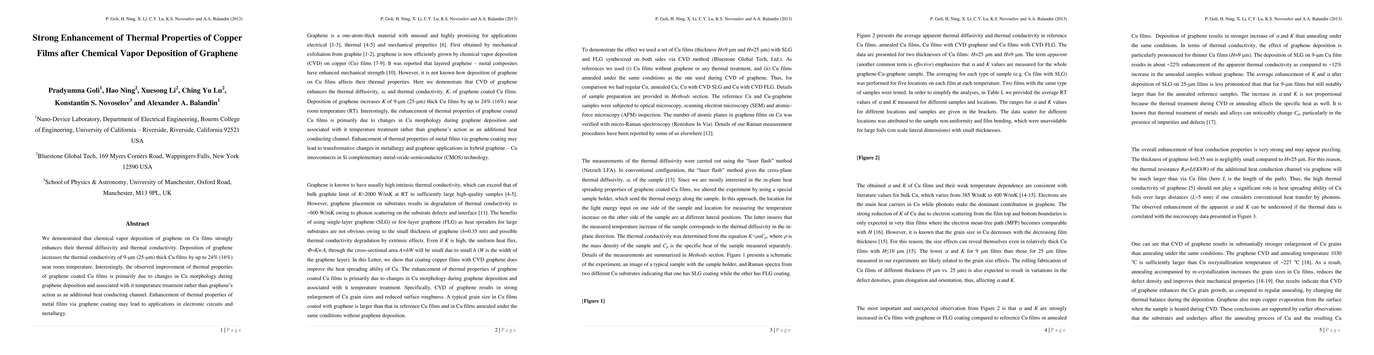 Summary: Chemical vapor deposition of graphene on copper films significantly boosts their thermal diffusivity and conductivity, primarily due to changes in Cu morphology during deposition rather than graphene acting as a heat channel. This enhancement could benefit electronic circuits and metallurgy.