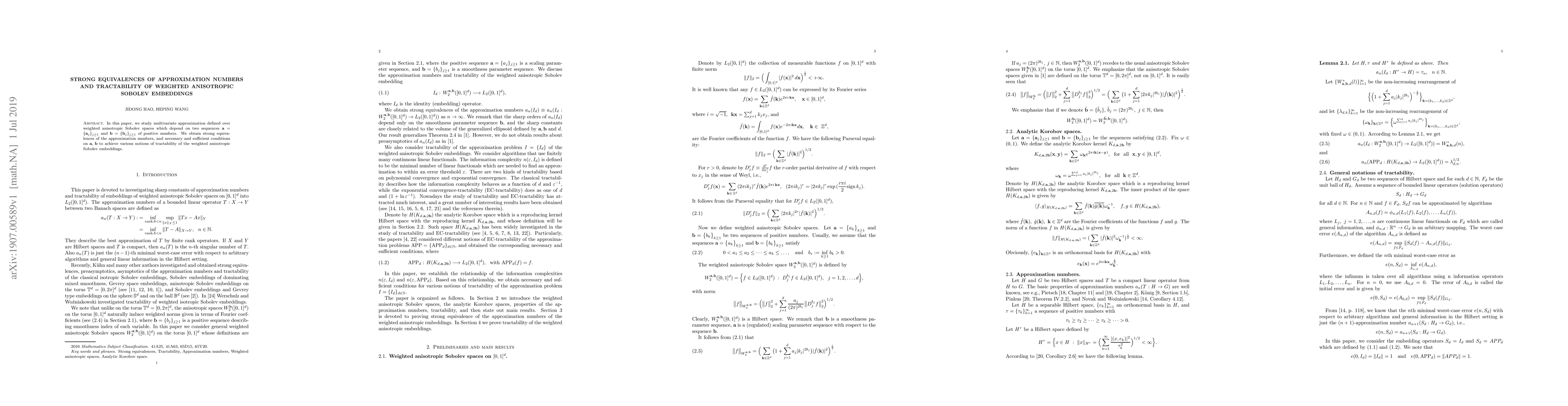 This paper investigates multivariate approximation within weighted anisotropic Sobolev spaces, deriving strong equivalences of approximation numbers and establishing necessary and sufficient conditions for the tractability of these embeddings based on sequences ${\bf a}$ and ${\bf b}$.