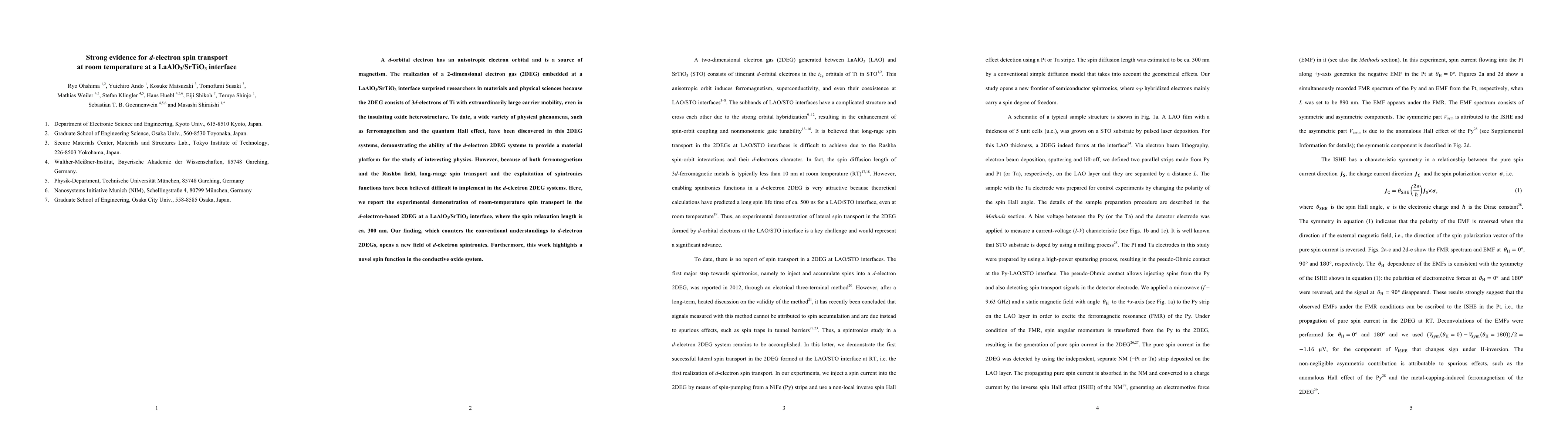 This paper demonstrates the first room-temperature spin transport in a d-electron-based 2DEG at a LaAlO3/SrTiO3 interface, achieving a spin relaxation length exceeding 200 nm, challenging previous beliefs about d-electron systems and opening new avenues for d-electron spintronics.