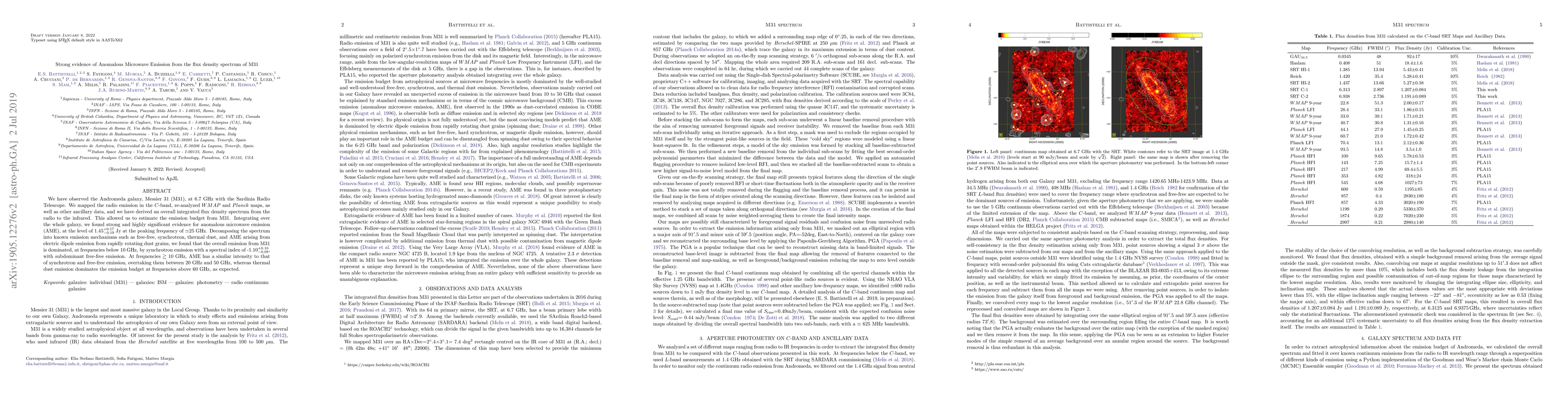 We have observed the Andromeda galaxy, Messier 31 (M31), at 6.7GHz with the Sardinia Radio Telescope. We mapped the radio emission in the C-band, re-analyzed WMAP and Planck maps, as well as other ancillary data, and we have derived an overall integrated flux density spectrum from the radio to the infrared. This allowed us to estimate the emission budget from M31. Integrating over the whole galaxy, we found strong and highly significant evidence for anomalous microwave emission (AME), at the level of (1.45+0.17-0.19)Jy at the peaking frequency of ~25GHz. Decomposing the spectrum into known emission mechanisms such as free-free, synchrotron, thermal dust, and AME arising from electric dipole emission from rapidly rotating dust grains, we found that the overall emission from M31 is dominated, at frequencies below 10GHz, by synchrotron emission with a spectral index of -1.10+0.10-0.08, with subdominant free-free emission. At frequencies >10GHz, AME has a similar intensity to that of synchrotron and free-free emission, overtaking them between 20GHz and 50GHz, whereas thermal dust emission dominates the emission budget at frequencies above 60GHz, as expected.