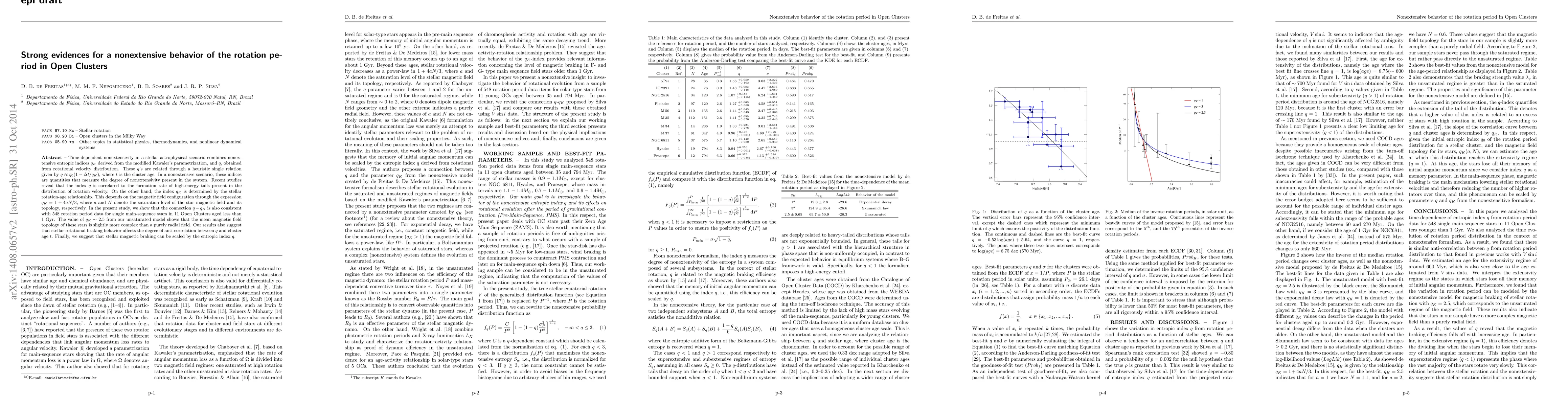 This study demonstrates a nonextensive behavior in the rotation periods of stars in Open Clusters, using nonextensive entropic indices $q_{K}$ and $q$ derived from stellar rotation and magnetic field configurations. The findings show a correlation between these indices and the rotation period data, suggesting that stellar magnetic braking influences the degree of anti-correlation between $q$ and cluster age.