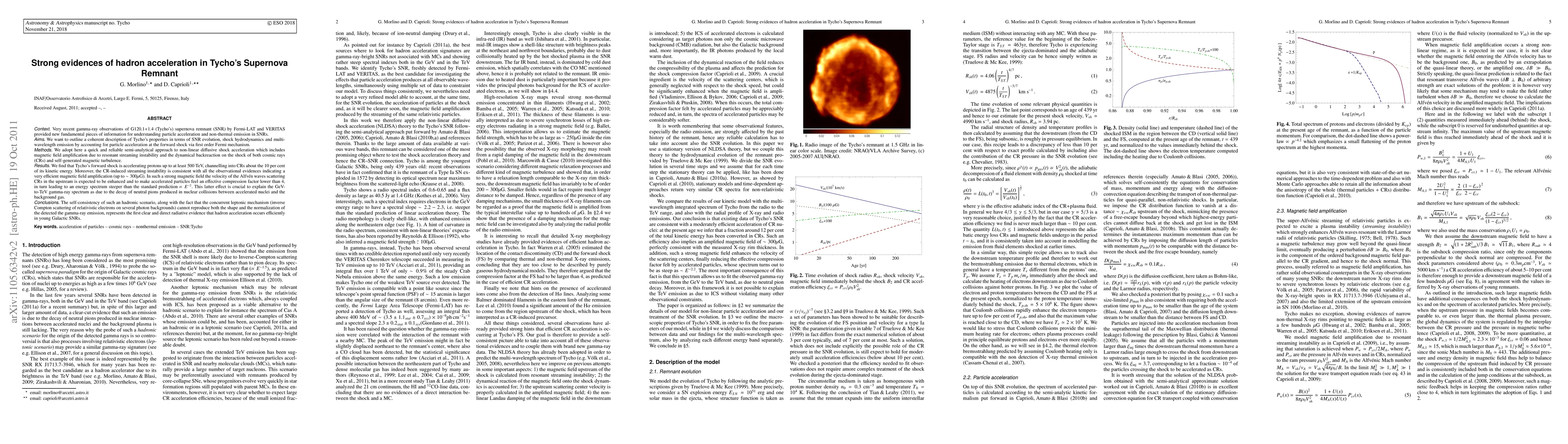 Recent gamma-ray observations of Tycho's supernova remnant reveal efficient hadron acceleration via the first-order Fermi mechanism, with protons reaching up to 500 TeV. This process channels about 10% of the shock's kinetic energy into cosmic rays, consistent with strong magnetic field amplification and the observed GeV-to-TeV gamma-ray spectrum.