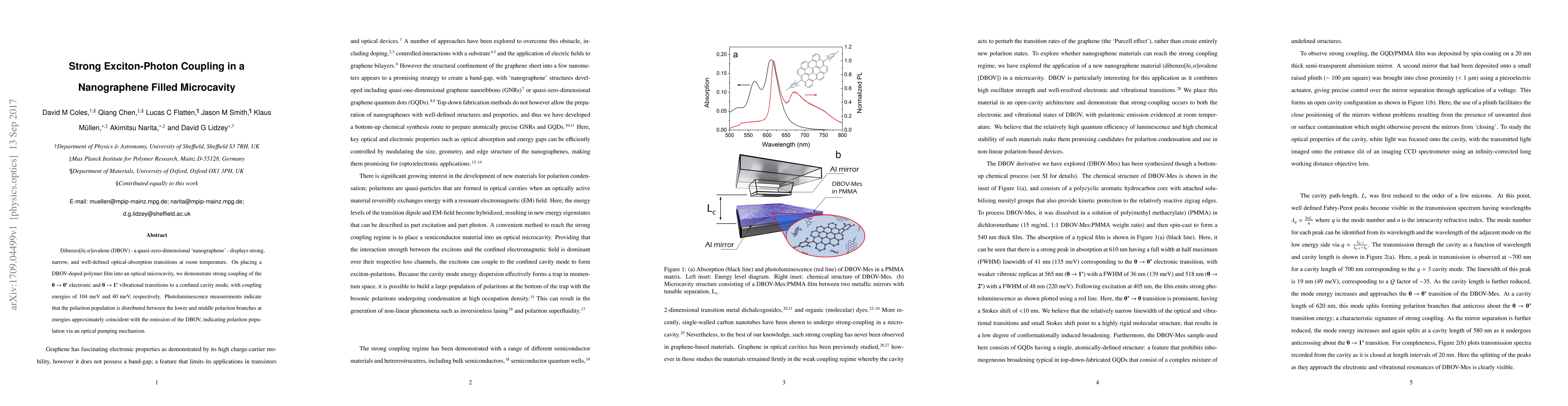 This paper demonstrates strong exciton-photon coupling in a nanographene (DBOV) within an optical microcavity, achieving coupling energies of 104 meV for electronic transitions and 40 meV for vibrational transitions. Photoluminescence reveals polariton distribution between lower and middle branches, indicating optical pumping mechanism.