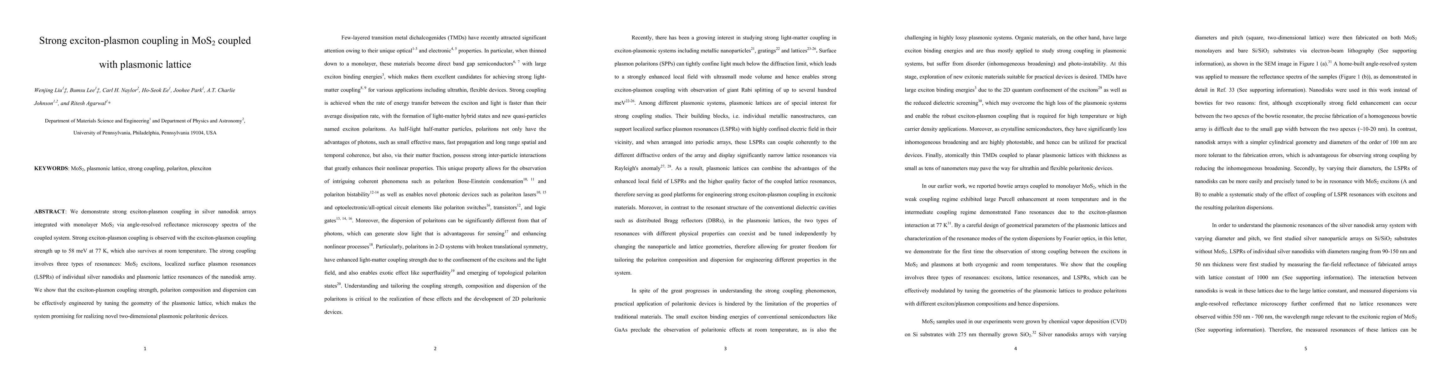 This paper demonstrates strong exciton-plasmon coupling in monolayer MoS2 integrated with silver nanodisk arrays, achieving a coupling strength of up to 58 meV that persists at room temperature. The coupling involves MoS2 excitons, localized surface plasmons, and lattice resonances, with the potential for engineering through plasmonic lattice geometry.