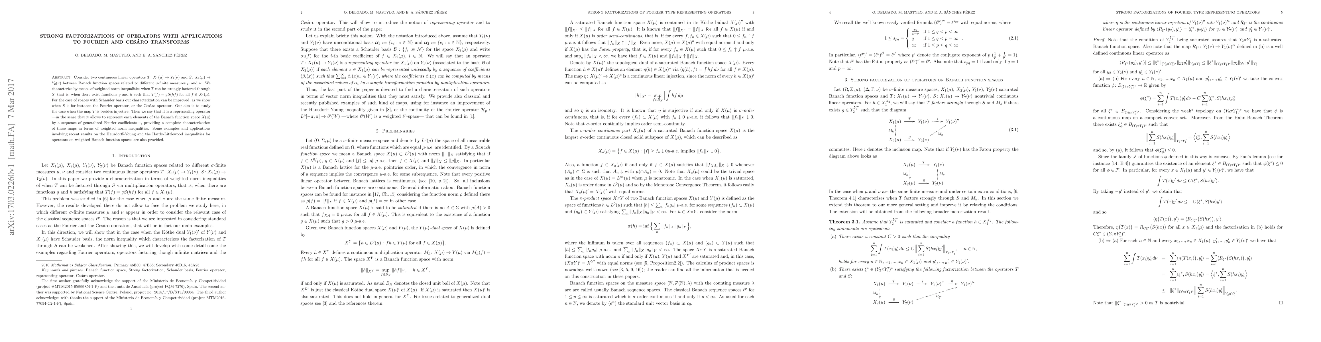 Consider two continuous linear operators $T\colon X_1(\mu)\to Y_1(\nu)$ and $S\colon X_2(\mu)\to Y_2(\nu)$ between Banach function spaces related to different $\sigma$-finite measures $\mu$ and $\nu$. We characterize by means of weighted norm inequalities when $T$ can be strongly factored through $S$, that is, when there exist functions $g$ and $h$ such that $T(f)=gS(hf)$ for all $f\in X_1(\mu)$. For the case of spaces with Schauder basis our characterization can be improved, as we show when $S$ is for instance the Fourier operator, or the Ces\`aro operator. Our aim is to study the case when the map $T$ is besides injective. Then we say that it is a~representing operator ---in the sense that it allows to represent each elements of the Banach function space $X(\mu)$ by a~sequence of generalized Fourier coefficients---, providing a complete characterization of these maps in terms of weighted norm inequalities. Some examples and applications involving recent results on the Hausdorff-Young and the Hardy-Littlewood inequalities for operators on weighted Banach function spaces are also provided.