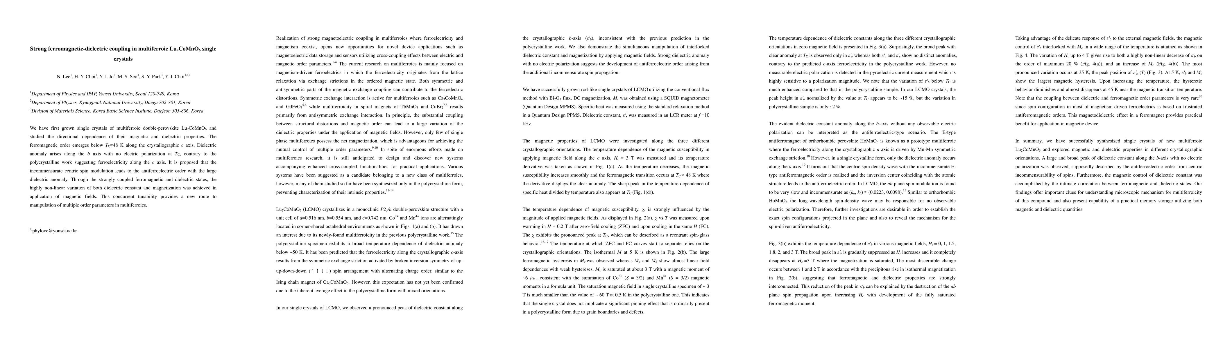 The research presents single crystals of Lu2CoMnO6, a multiferroic material. It finds ferromagnetic order along the c-axis below 48K and a dielectric anomaly along the b-axis at the same temperature, contradicting previous polycrystalline studies. The application of magnetic fields strongly couples ferromagnetic and dielectric states, enabling efficient manipulation of multiple order parameters.