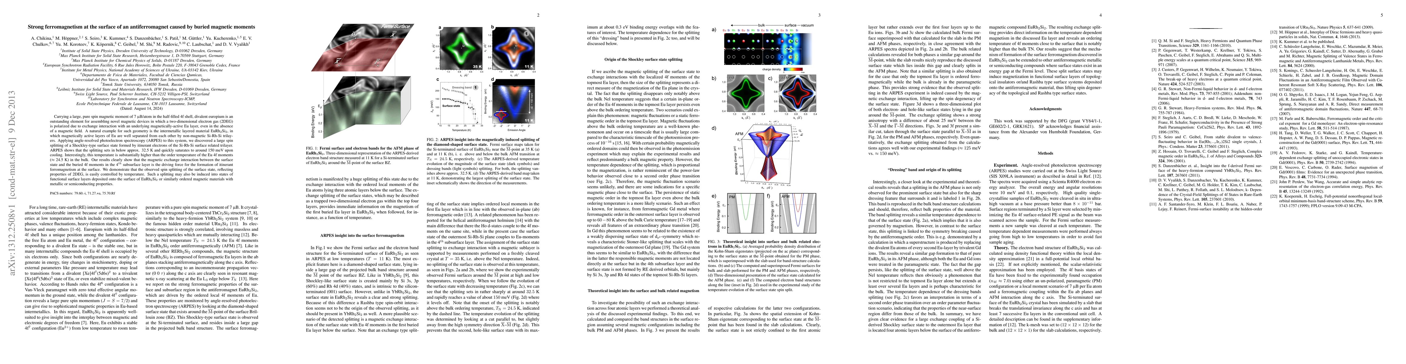 Carrying a large, pure spin magnetic moment of 7 $\mu$bohr/atom in the half-filled 4f shell, divalent europium is an outstanding element for assembling novel magnetic devices in which a two-dimensional electron gas (2DEG) is polarized due to exchange interaction with an underlying magnetically-active Eu layer, even in the absence of a magnetic field. A natural example for such geometry is the intermetallic layered material EuRh$_2$Si$_2$, in which magnetically active layers of Eu are well separated from each other by non-magnetic Si-Rh-Si trilayers. Applying angle-resolved photoelectron spectroscopy (ARPES) to this system, we discovered a large spin splitting of a Shockley-type surface state formed by itinerant electrons of the Si-Rh-Si surface related trilayer. ARPES shows that the splitting sets in below approx. 32.5K and quickly saturates to around 150meV upon cooling. Interestingly, this temperature is substantially higher than the order temperature of the Eu 4f moments (approx. 24.5K) in the bulk. Our results clearly show that the magnetic exchange interaction between the surface state and the buried 4f moments in the 4th subsurface layer is the driving force for the formation of itinerant ferromagnetism at the surface. We demonstrate that the observed spin splitting of the surface state, reflecting properties of 2DEG, is easily controlled by temperature. Such a splitting may also be induced into states of functional surface layers deposited onto the surface of EuRh$_2$Si$_2$ or similarly ordered magnetic materials with metallic or semiconducting properties.