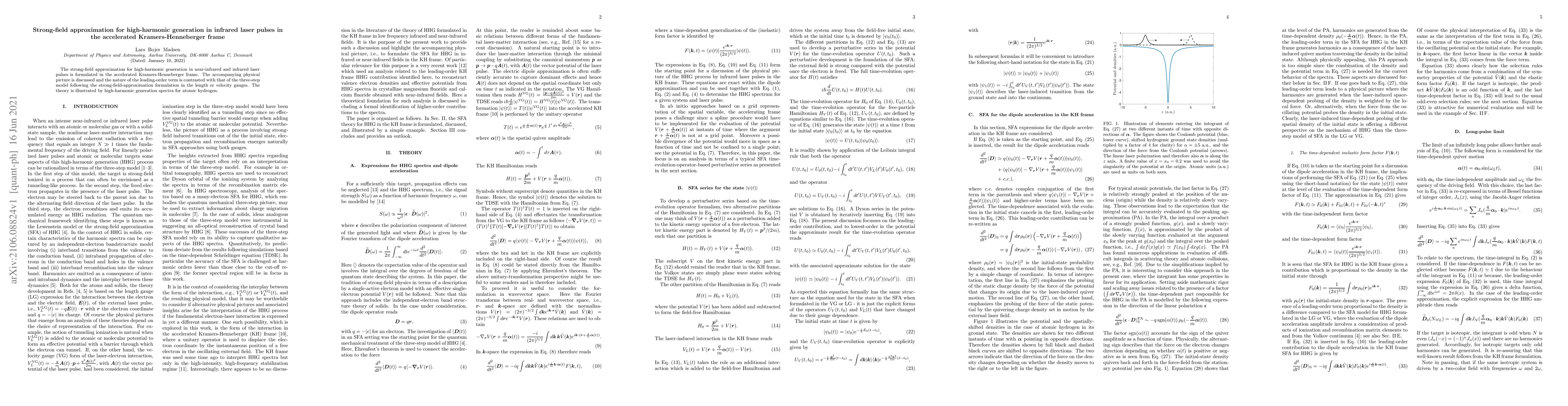 This paper formulates a strong-field approximation for high-harmonic generation in infrared laser pulses using the accelerated Kramers-Henneberger frame, contrasting it with the three-step model and illustrating it with hydrogen spectra.