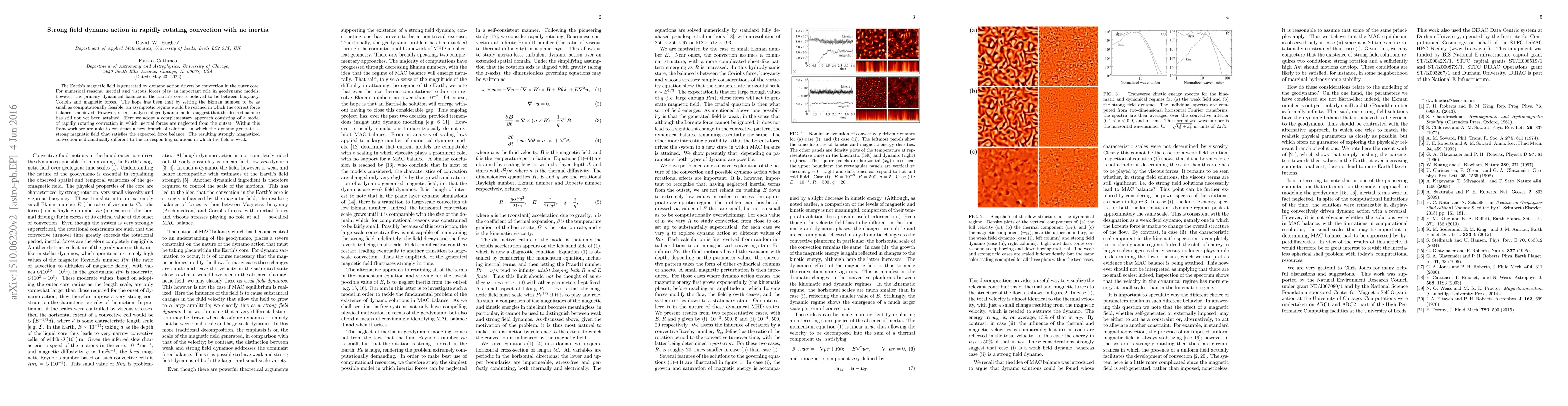 This paper explores dynamo action in rapidly rotating convection without considering inertial forces, achieving a strong magnetic field that aligns with the expected force balance between buoyancy, Coriolis, and magnetic forces, contrasting with weak-field solutions.