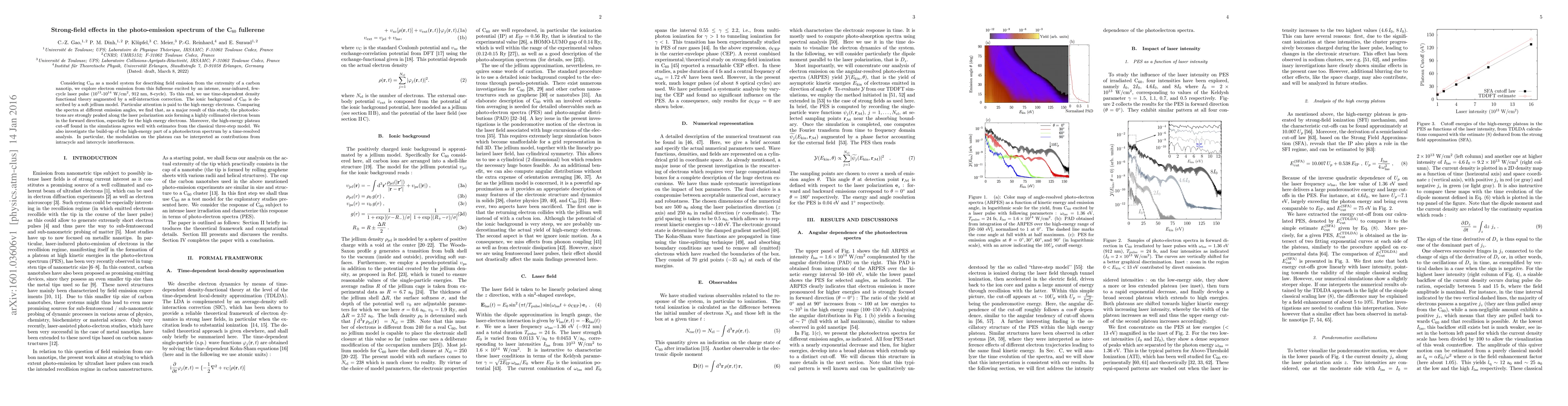 Considering C$_{60}$ as a model system for describing field emission from the extremity of a carbon nanotip, we explore electron emission from this fullerene excited by an intense, near-infrared, few-cycle laser pulse ($10^{13}$-$10^{14}~{\rm W/cm}^2$, 912 nm, 8-cycle). To this end, we use time-dependent density functional theory augmented by a self-interaction correction. The ionic background of C$_{60}$ is described by a soft jellium model. Particular attention is paid to the high energy electrons. Comparing the spectra at different emission angles, we find that, as a major result of this study, the photoelectrons are strongly peaked along the laser polarization axis forming a highly collimated electron beam in the forward direction, especially for the high energy electrons. Moreover, the high-energy plateau cut-off found in the simulations agrees well with estimates from the classical three-step model. We also investigate the build-up of the high-energy part of a photoelectron spectrum by a time-resolved analysis. In particular, the modulation on the plateau can be interpreted as contributions from intracycle and intercycle interferences.