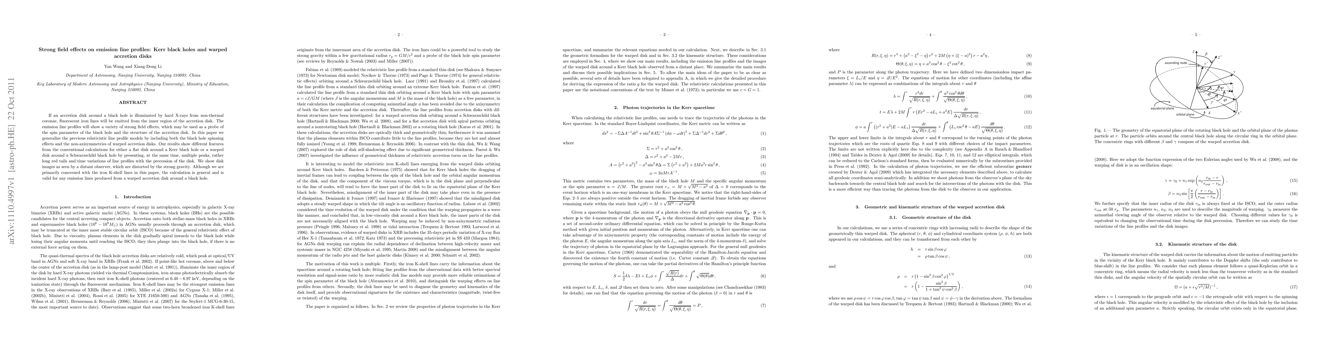 This paper investigates strong field effects on emission line profiles from warped accretion disks around Kerr black holes, revealing multiple peaks, long red tails, and time variations due to disk precession. The study generalizes previous models, providing insights into black hole spin and disk structure.