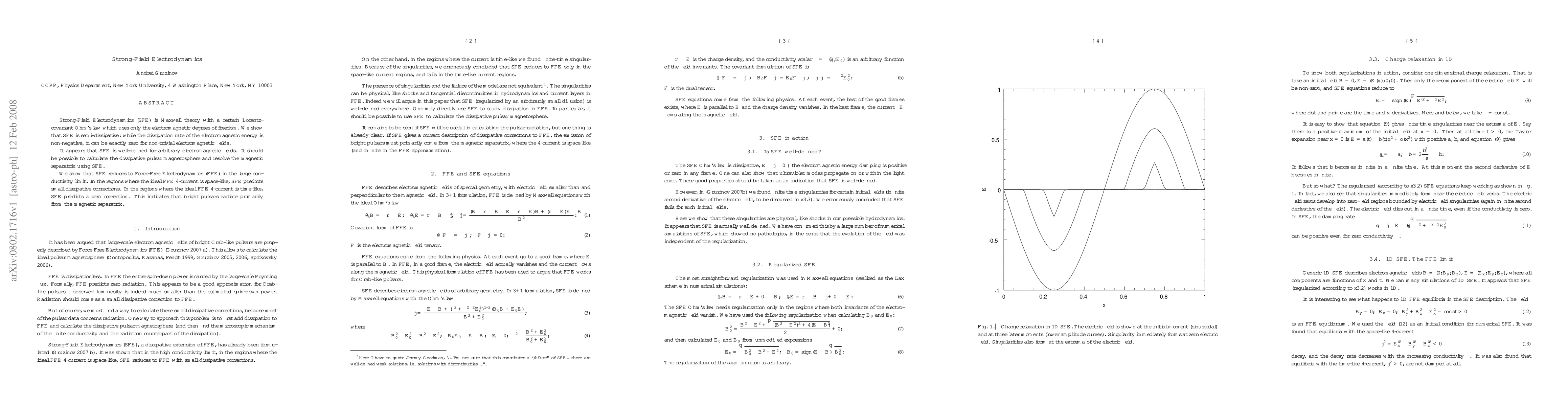 Strong-Field Electrodynamics (SFE) is a Lorentz-covariant extension of Maxwell theory with a semi-dissipative nature, allowing for zero dissipation in non-trivial electromagnetic fields. SFE reduces to Force-Free Electrodynamics in high conductivity regions, predicting small dissipative corrections where the current is space-like.
