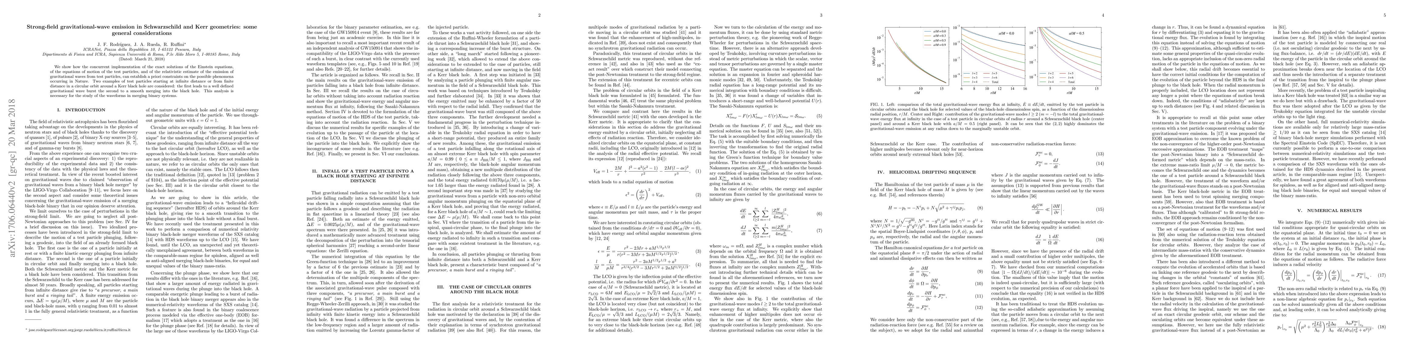 We show how the concurrent implementation of the exact solutions of the Einstein equations, of the equations of motion of the test particles, and of the relativistic estimate of the emission of gravitational waves from test particles, can establish a priori constraints on the possible phenomena occurring in Nature. Two examples of test particles starting at infinite distance or from finite distance in a circular orbit around a Kerr black hole are considered: the first leads to a well defined gravitational wave burst the second to a smooth merging into the black hole. This analysis is necessary for the study of the waveforms in merging binary systems.