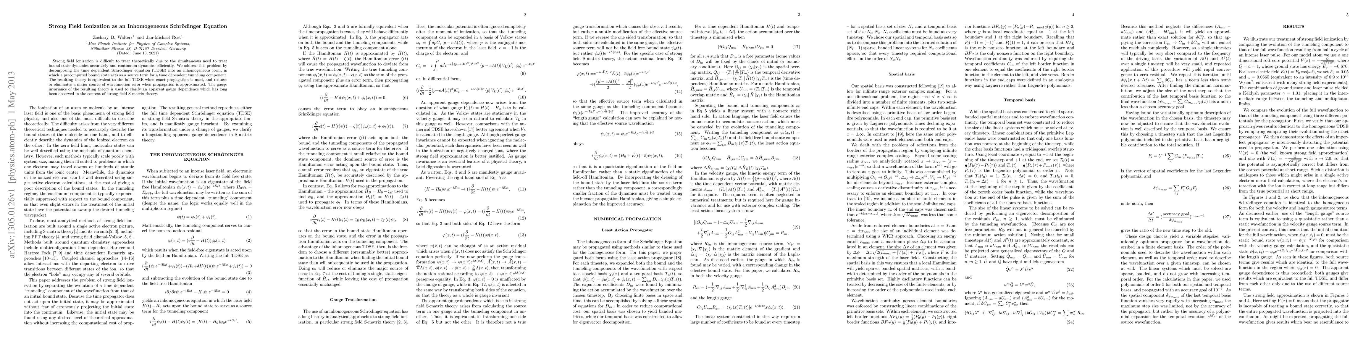 The paper introduces an inhomogeneous Schrödinger equation formulation for strong field ionization, which is gauge invariant and reduces computational costs by separating bound and tunneling components.