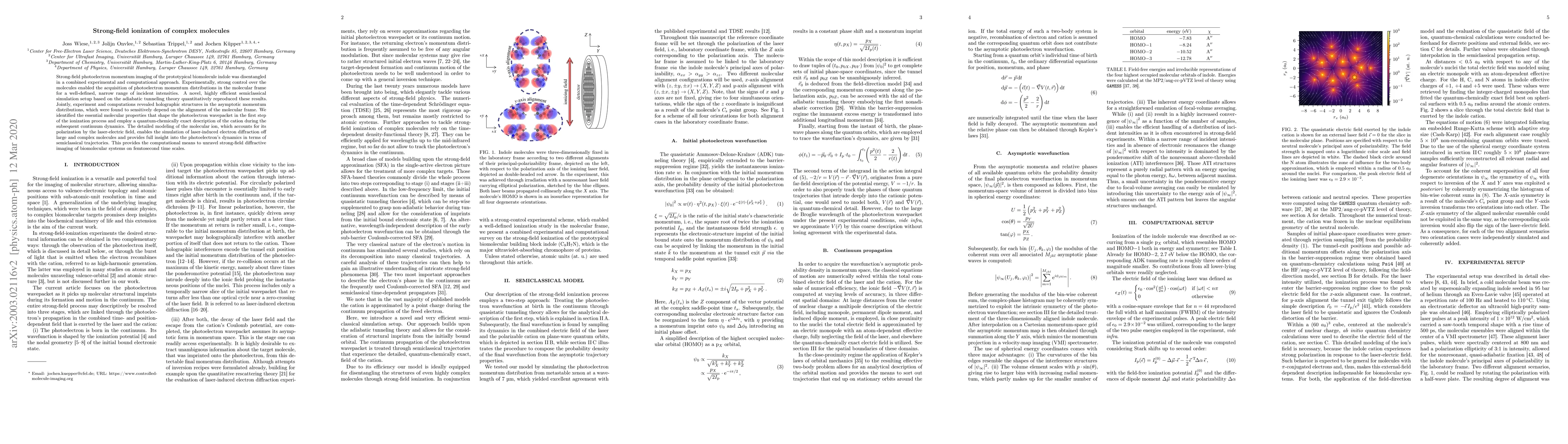 Strong-field photoelectron momentum imaging of the prototypical biomolecule indole was disentangled in a combined experimental and computational approach. Experimentally, strong control over the molecules enabled the acquisition of photoelectron momentum distributions in the molecular frame for a well-defined, narrow range of incident intensities. A novel, highly efficient semiclassical simulation setup based on the adiabatic tunneling theory quantitatively reproduced these results. Jointly, experiment and computations revealed holographic structures in the asymptotic momentum distributions, which were found to sensitively depend on the alignment of the molecular frame. We identified the essential molecular properties that shape the photoelectron wavepacket in the first step of the ionization process and employ a quantum-chemically exact description of the cation during the subsequent continuum dynamics. The detailed modeling of the molecular ion, which accounts for its polarization by the laser-electric field, enables the simulation of laser-induced electron diffraction off large and complex molecules and provides full insight into the photoelectron's dynamics in terms of semiclassical trajectories. This provides the computational means to unravel strong-field diffractive imaging of biomolecular systems on femtosecond time scales.