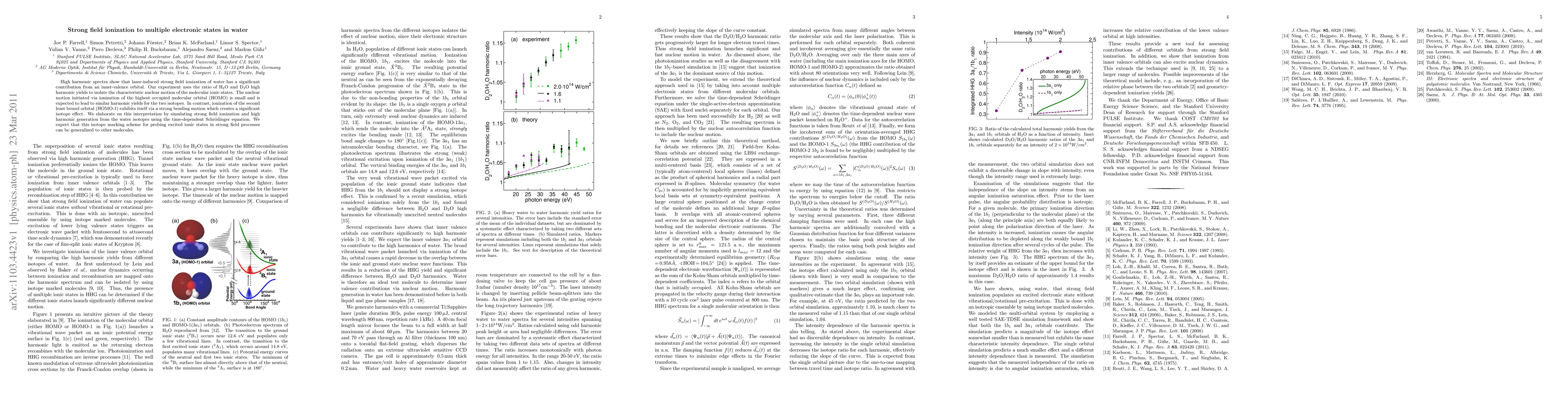This research investigates laser-induced strong field ionization in water, revealing that ionization from the second least bound orbital (HOMO-1) leads to significant bending motion and an isotope effect. The study uses high harmonic spectra and isotopic comparisons between H2O and D2O to isolate and characterize the nuclear motion in molecular ionic states.