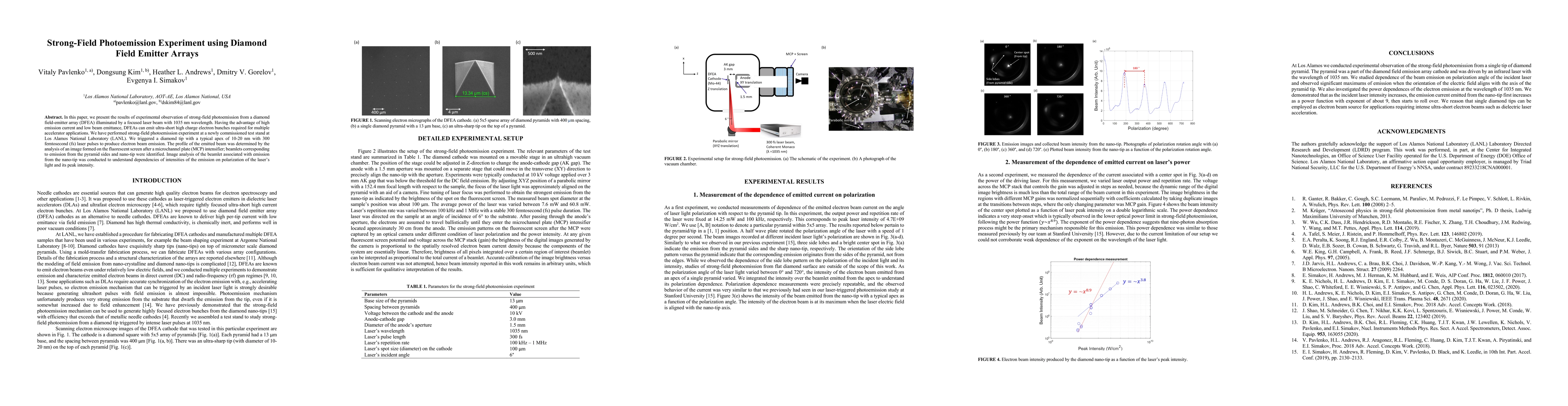 In this paper, we present the results of experimental observation of strong-field photoemission from a diamond field-emitter array (DFEA) illuminated by a focused laser beam with 1035 nm wavelength. Having the advantage of high emission current and low beam emittance, DFEAs can emit ultra-short high charge electron bunches required for multiple accelerator applications. We have performed strong-field photoemission experiment at a newly commissioned test stand at Los Alamos National Laboratory (LANL). We triggered a diamond tip with a typical apex of 10-20 nm with 300 femtosecond (fs) laser pulses to produce electron beam emission. The profile of the emitted beam was determined by the analysis of an image formed on the fluorescent screen after a microchannel plate (MCP) intensifier; beamlets corresponding to emission from the pyramid sides and nano-tip were identified. Image analysis of the beamlet associated with emission from the nano-tip was conducted to understand dependencies of intensities of the emission on polarization of the laser's light and its peak intensity.