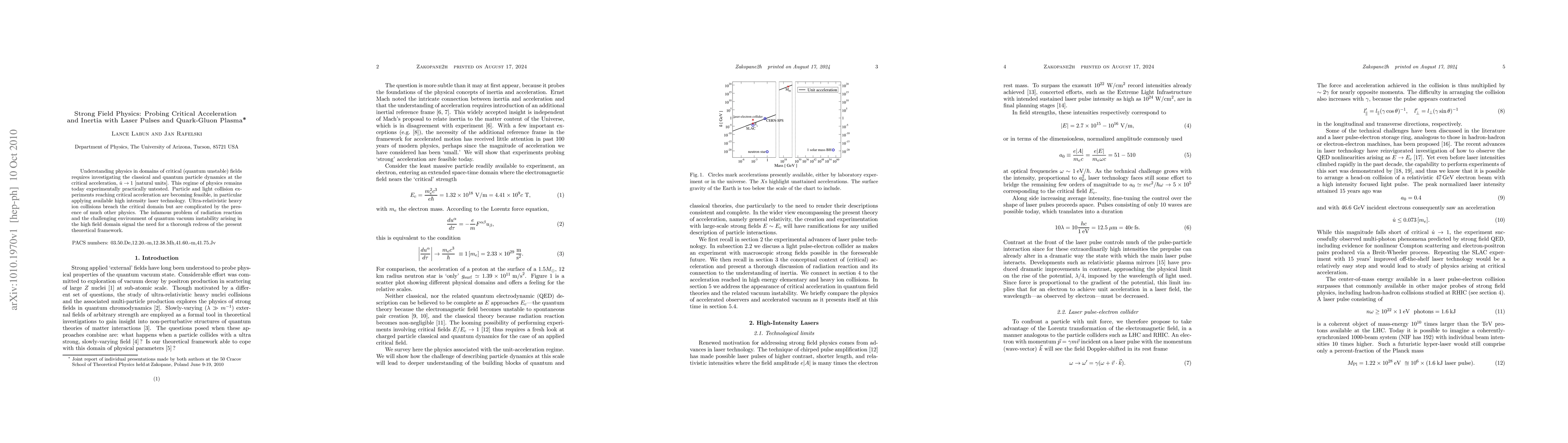 Understanding physics in domains of critical (quantum unstable) fields requires investigating the classical and quantum particle dynamics at the critical acceleration, $\dot u \to 1$ [natural units]. This regime of physics remains today experimentally practically untested. Particle and light collision experiments reaching critical acceleration are becoming feasible, in particular applying available high intensity laser technology. Ultra-relativistic heavy ion collisions breach the critical domain but are complicated by the presence of much other physics. The infamous problem of radiation reaction and the challenging environment of quantum vacuum instability arising in the high field domain signal the need for a thorough redress of the present theoretical framework.