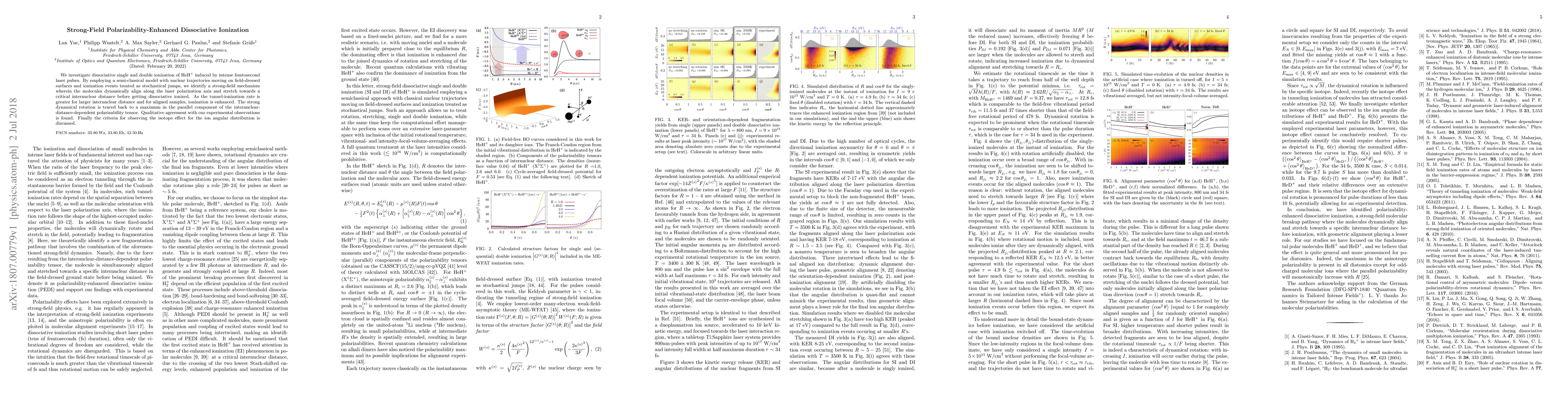 This paper explores the dissociative ionization of HeH+ under intense femtosecond laser pulses, revealing a strong-field mechanism where molecular alignment and stretching along the laser polarization axis enhance ionization. The study finds that the polarizability-driven rotation and increased internuclear distance boost the ionization rate, corroborated by experimental results.