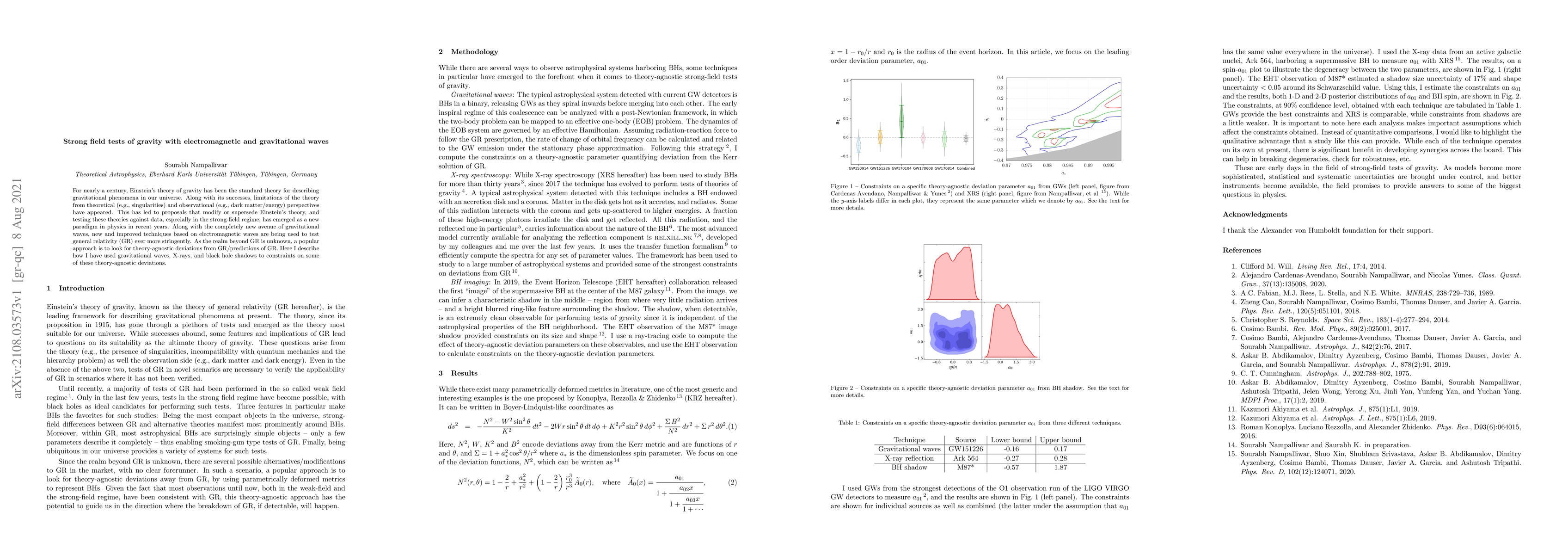 For nearly a century, Einstein's theory of gravity has been the standard theory for describing gravitational phenomena in our universe. Along with its successes, limitations of the theory from theoretical (e.g., singularities) and observational (e.g., dark matter/energy) perspectives have appeared. This has led to proposals that modify or supersede Einstein's theory, and testing these theories against data, especially in the strong-field regime, has emerged as a new paradigm in physics in recent years. Along with the completely new avenue of gravitational waves, new and improved techniques based on electromagnetic waves are being used to test general relativity (GR) ever more stringently. As the realm beyond GR is unknown, a popular approach is to look for theory-agnostic deviations from GR/predictions of GR. Here I describe how I have used gravitational waves, X-rays, and black hole shadows to put constraints on some of these theory-agnostic deviations.