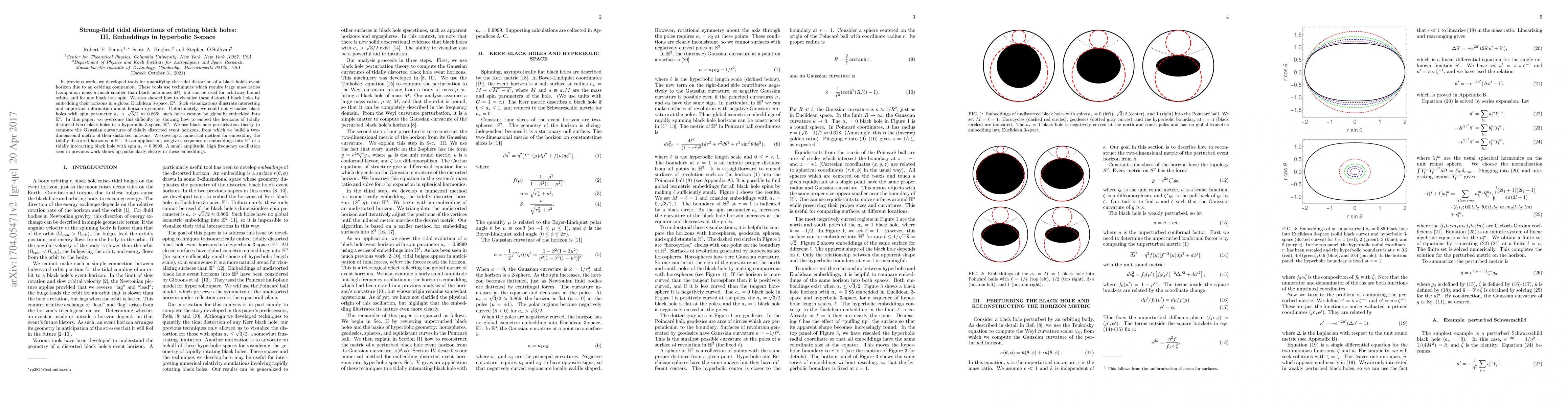 In previous work, we developed tools for quantifying the tidal distortion of a black hole's event horizon due to an orbiting companion. These tools use techniques which require large mass ratios (companion mass $\mu$ much smaller than black hole mass $M$), but can be used for arbitrary bound orbits, and for any black hole spin. We also showed how to visualize these distorted black holes by embedding their horizons in a global Euclidean 3-space, ${\mathbb{E}}^3$. Such visualizations illustrate interesting and important information about horizon dynamics. Unfortunately, we could not visualize black holes with spin parameter $a_* > \sqrt{3}/2 \approx 0.866$: such holes cannot be globally embedded into ${\mathbb{E}}^3$. In this paper, we overcome this difficulty by showing how to embed the horizons of tidally distorted Kerr black holes in a hyperbolic 3-space, ${\mathbb{H}}^3$. We use black hole perturbation theory to compute the Gaussian curvatures of tidally distorted event horizons, from which we build a two-dimensional metric of their distorted horizons. We develop a numerical method for embedding the tidally distorted horizons in ${\mathbb{H}}^3$. As an application, we give a sequence of embeddings into ${\mathbb{H}}^3$ of a tidally interacting black hole with spin $a_*=0.9999$. A small amplitude, high frequency oscillation seen in previous work shows up particularly clearly in these embeddings.