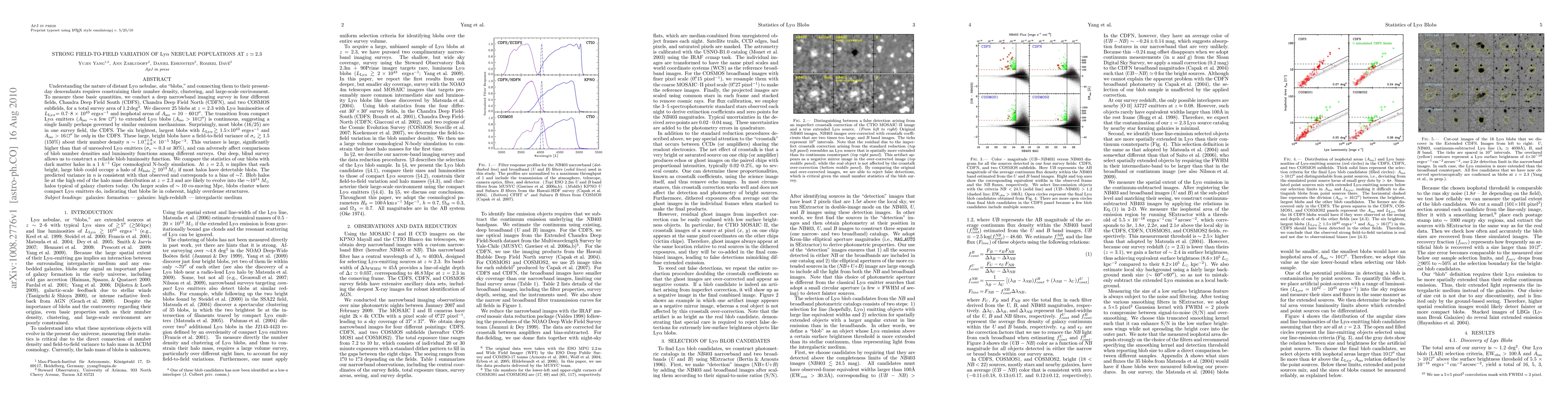 Understanding the nature of distant Ly-alpha nebulae ("blobs") and connecting them to their present-day descendants requires constraining their number density, clustering, and large-scale environment. To measure these basic quantities, we conduct a deep narrowband imaging survey in four different fields, Chandra Deep Field South (CDFS), Chandra Deep Field North, and two COSMOS subfields, for a total survey area of 1.2deg^2. We discover 25 blobs at z=2.3 with Ly-alpha luminosities of 0.7-8x10^43 erg/s and isophotal areas of Aiso = 10-60 arcsec^2. The transition from compact Ly-alpha emitters (Aiso ~ a few arcsec^2) to extended blobs (Aiso > 10 arcsec^2) is continuous, suggesting a single family perhaps governed by similar emission mechanisms. Surprisingly, most blobs (16/25) are in one survey field, the CDFS. The six brightest, largest blobs with L > 1.5x10^43 erg/s and Aiso > 16 arcsec^2 lie only in the CDFS. These large, bright blobs have a field-to-field variance of sigma_v >~ 1.5 (150%) about their number density n ~ 1.0x10^-5 Mpc^-3. This variance is large, significantly higher than that of unresolved LAEs (sigma_v ~ 0.3 or 30%), and can adversely affect comparisons of blob number densities and luminosity functions among different surveys. We compare the statistics of our blobs with dark matter halos in a 1 Gpc/h cosmological N-body simulation. At z=2.3, the number density (n) implies that each bright, large blob could occupy a halo of M_halo > 10^13 Msun if most halos have detectable blobs. The predicted variance in n is consistent with that observed and corresponds to a bias of ~7. Blob halos lie at the high end of the halo mass distribution at z=2.3 and are likely to evolve into the ~10^14 Msun halos typical of galaxy clusters today. On larger scales of ~10 co-moving Mpc, blobs cluster where compact LAEs do, indicating that blobs lie in coherent, highly overdense structures.