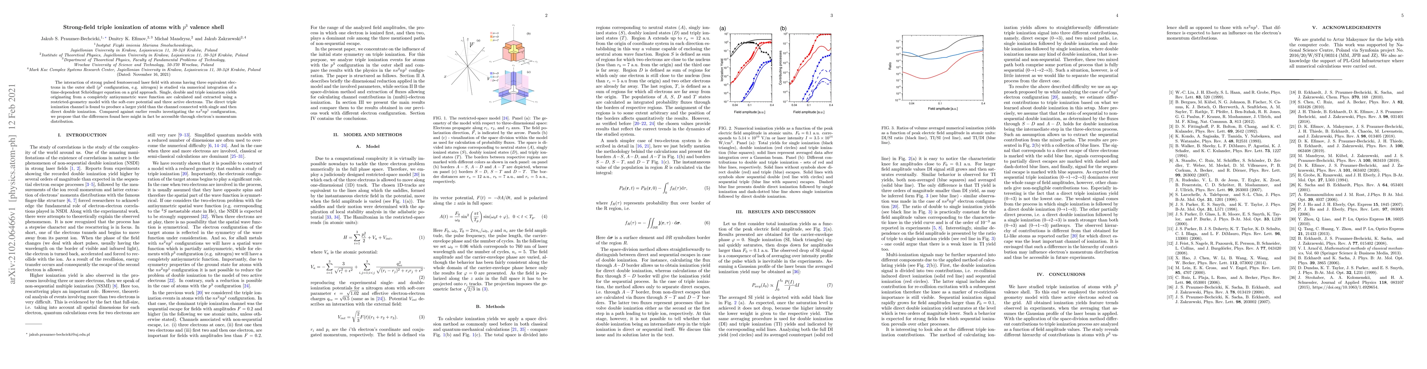 The interaction of strong pulsed femtosecond laser field with atoms having three equivalent electrons in the outer shell ($p^3$ configuration, e.g. nitrogen) is studied via numerical integration of a time-dependent Schr\"{o}dinger equation on a grid approach. Single, double and triple ionization yields originating from a completely antisymmetric wave function are calculated and extracted using a restricted-geometry model with the soft-core potential and three active electrons. The direct triple ionization channel is found to produce a larger yield than the channel connected with single and then direct double ionization. Compared against earlier results investigating the $n s^ 2 n p^1$ configuration, we propose that the differences found here might in fact be accessible through electron's momentum distribution.