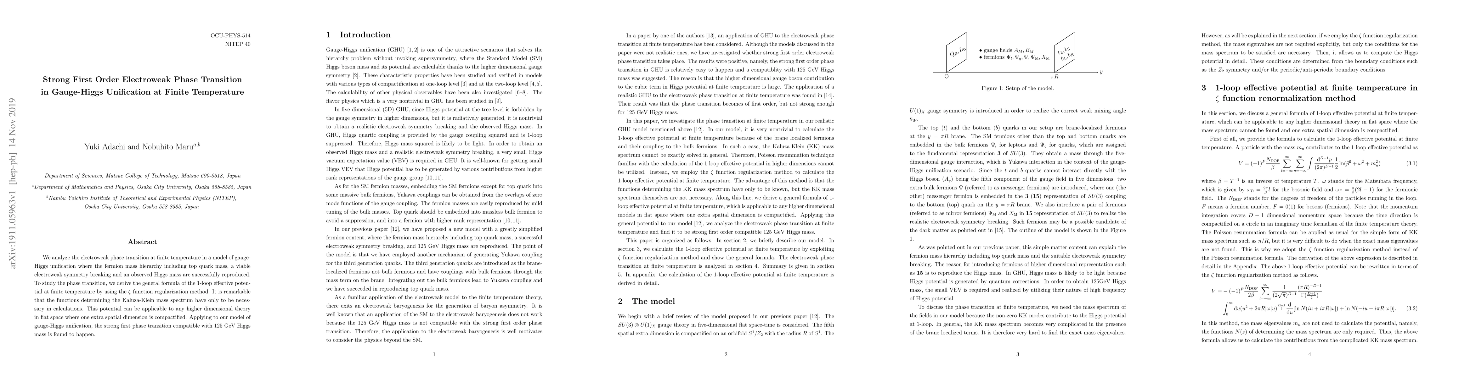 The study investigates the electroweak phase transition at finite temperature in a gauge-Higgs unification model, deriving a 1-loop effective potential formula using $\zeta$ function regularization. The model predicts a strong first-order phase transition consistent with a 125 GeV Higgs mass.