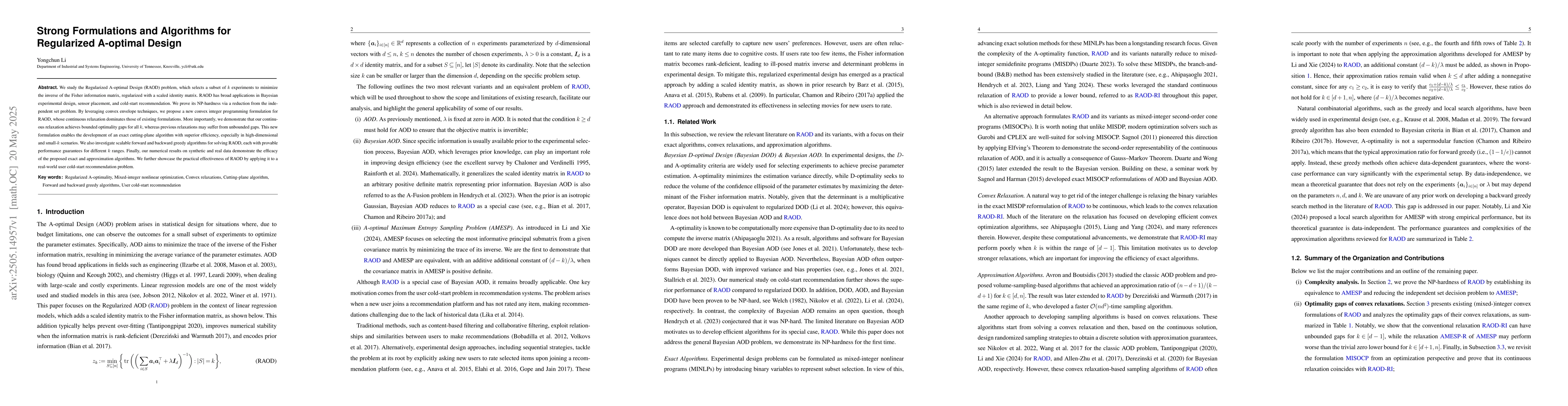 This research is significant as it advances the field of Bayesian experimental design, sensor placement, and cold-start recommendation systems by providing strong formulations and efficient algorithms for the Regularized A-optimal Design problem, thereby improving design efficiency and accuracy in practical applications.
