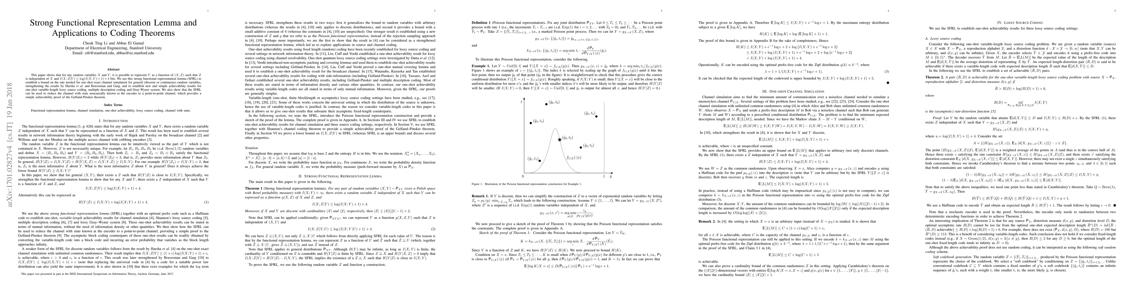 This paper shows that for any random variables $X$ and $Y$, it is possible to represent $Y$ as a function of $(X,Z)$ such that $Z$ is independent of $X$ and $I(X;Z|Y)\le\log(I(X;Y)+1)+4$ bits. We use this strong functional representation lemma (SFRL) to establish a bound on the rate needed for one-shot exact channel simulation for general (discrete or continuous) random variables, strengthening the results by Harsha et al. and Braverman and Garg, and to establish new and simple achievability results for one-shot variable-length lossy source coding, multiple description coding and Gray-Wyner system. We also show that the SFRL can be used to reduce the channel with state noncausally known at the encoder to a point-to-point channel, which provides a simple achievability proof of the Gelfand-Pinsker theorem.