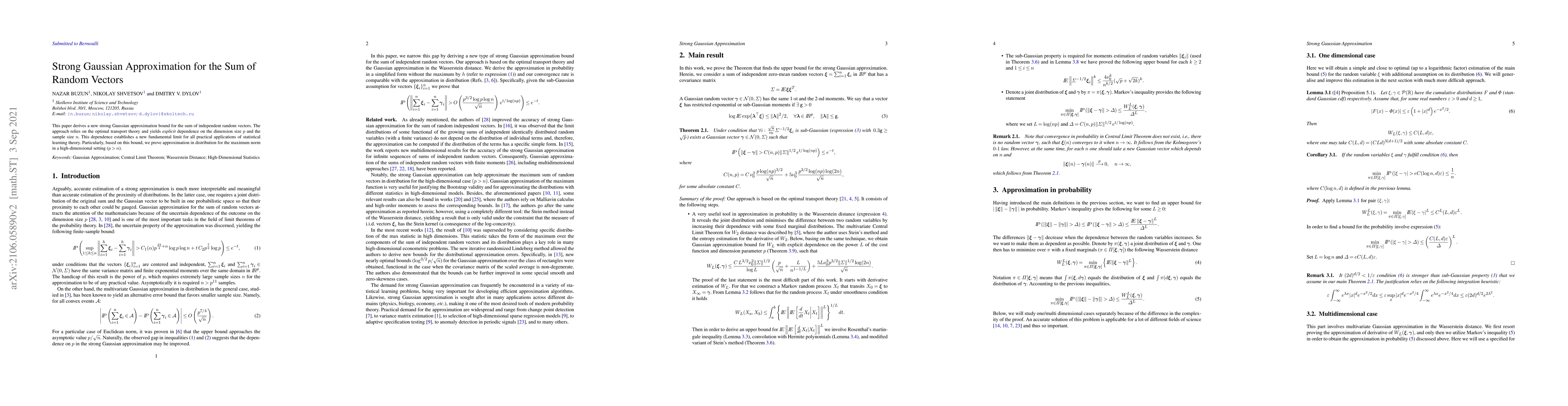 This paper derives a new strong Gaussian approximation bound for the sum of independent random vectors. The approach relies on the optimal transport theory and yields \textit{explicit} dependence on the dimension size $p$ and the sample size $n$. This dependence establishes a new fundamental limit for all practical applications of statistical learning theory. Particularly, based on this bound, we prove approximation in distribution for the maximum norm in a high-dimensional setting ($p >n$).