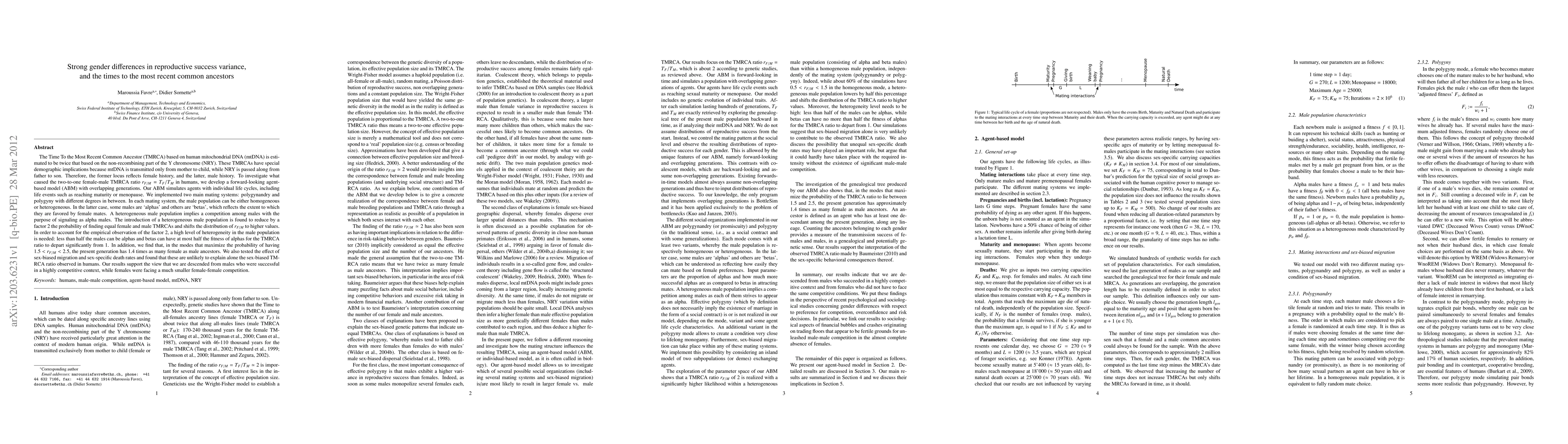 The Time To the Most Recent Common Ancestor (TMRCA) based on human mitochondrial DNA (mtDNA) is estimated to be twice that based on the non-recombining part of the Y chromosome (NRY). These TMRCAs have special demographic implications because mtDNA is transmitted only from mother to child, and NRY from father to son. Therefore, mtDNA reflects female history, and NRY, male history. To investigate what caused the two-to-one female-male TMRCA ratio in humans, we develop a forward-looking agent-based model (ABM) with overlapping generations and individual life cycles. We implement two main mating systems: polygynandry and polygyny with different degrees in between. In each mating system, the male population can be either homogeneous or heterogeneous. In the latter case, some males are `alphas' and others are `betas', which reflects the extent to which they are favored by female mates. A heterogeneous male population implies a competition among males with the purpose of signaling as alphas. The introduction of a heterogeneous male population is found to reduce by a factor 2 the probability of finding equal female and male TMRCAs and shifts the distribution of the TMRCA ratio to higher values. We find that high male-male competition is necessary to reproduce a TMRCA ratio of 2: less than half the males can be alphas and betas can have at most half the fitness of alphas. In addition, in the modes that maximize the probability of having a TMRCA ratio between 1.5 and 2.5, the present generation has 1.4 times as many female as male ancestors. We also tested the effect of sex-biased migration and sex-specific death rates and found that these are unlikely to explain alone the sex-biased TMRCA ratio observed in humans. Our results support the view that we are descended from males who were successful in a highly competitive context, while females were facing a much smaller female-female competition.