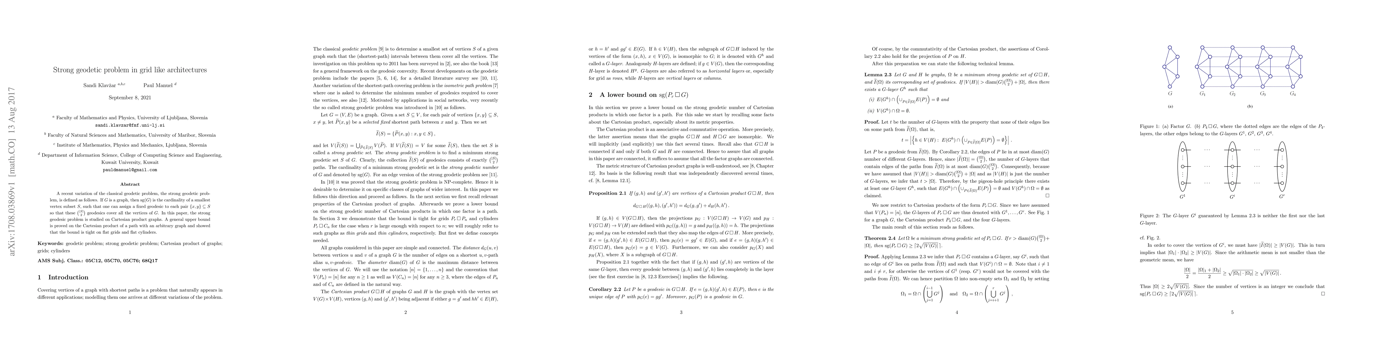 A recent variation of the classical geodetic problem, the strong geodetic problem, is defined as follows. If $G$ is a graph, then ${\rm sg}(G)$ is the cardinality of a smallest vertex subset $S$, such that one can assign a fixed geodesic to each pair $\{x,y\}\subseteq S$ so that these $\binom{|S|}{2}$ geodesics cover all the vertices of $G$. In this paper, the strong geodesic problem is studied on Cartesian product graphs. A general upper bound is proved on the Cartesian product of a path with an arbitrary graph and showed that the bound is tight on flat grids and flat cylinders.