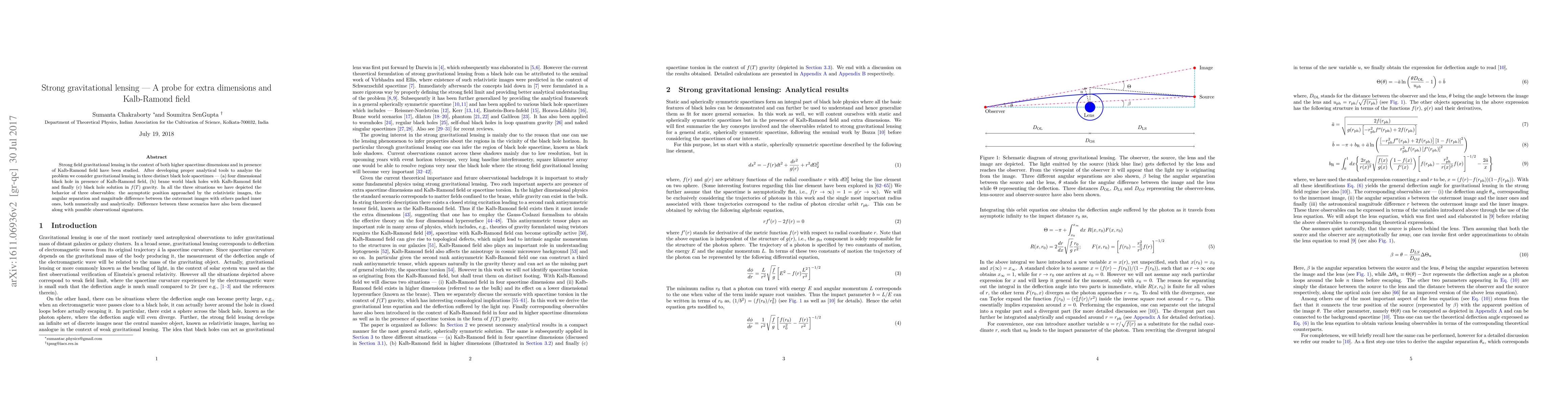 Strong field gravitational lensing in the context of both higher spacetime dimensions and in presence of Kalb-Ramond field have been studied. After developing proper analytical tools to analyze the problem we consider gravitational lensing in three distinct black hole spacetimes --- (a) four dimensional black hole in presence of Kalb-Ramond field, (b) brane world black holes with Kalb-Ramond field and finally (c) black hole solution in $f(T)$ gravity. In all the three situations we have depicted the behavior of three observables: the asymptotic position approached by the relativistic images, the angular separation and magnitude difference between the outermost images with others packed inner ones, both numerically and analytically. Difference between these scenarios have also been discussed along with possible observational signatures.