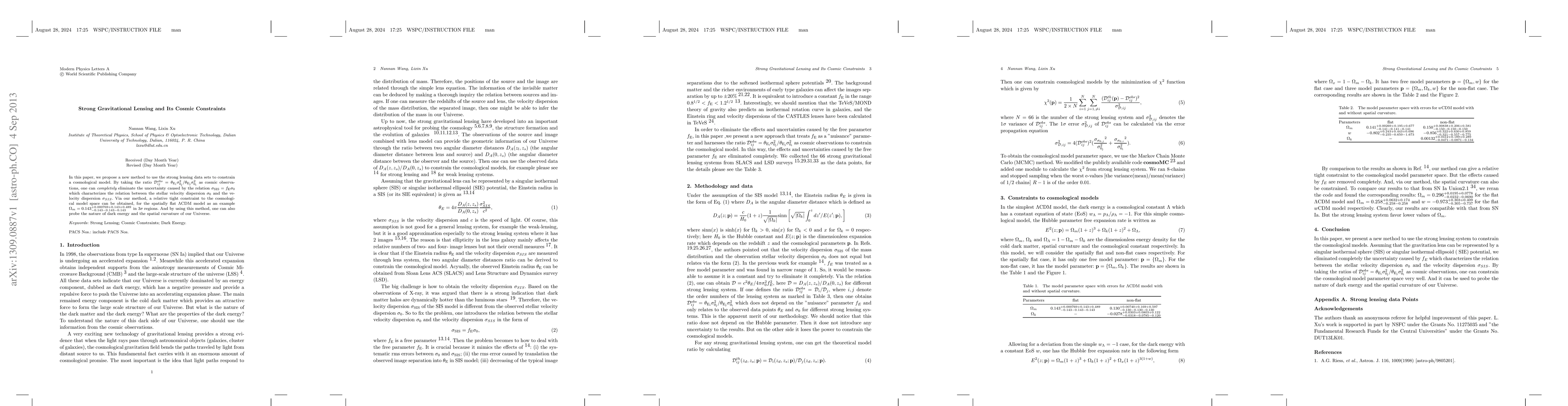 In this paper, we propose a new method to use the strong lensing data sets to constrain a cosmological model. By taking the ratio $\mathcal{D}^{obs}_{ij}=\theta_{\mathrm{E_{\mathrm{i}}}}\sigma_{\mathrm{0_{\mathrm{j}}}}^2/\theta_{\mathrm{E_{\mathrm{j}}}}\sigma_{\mathrm{0_{\mathrm{i}}}}^2$ as cosmic observations, one can {\it completely} eliminate the uncertainty caused by the relation $\sigma_{\mathrm{SIS}}=f_{\mathrm{E}}\sigma_0$ which characterizes the relation between the stellar velocity dispersion $\sigma_0$ and the velocity dispersion $\sigma_{SIS}$. Via our method, a relative tight constraint to the cosmological model space can be obtained, for the spatially flat $\Lambda$CDM model as an example $\Omega_m=0.143_{- 0.143-0.143-0.143}^{+ 0.000769+0.143+0.489}$ in $3\sigma$ regions. And by using this method, one can also probe the nature of dark energy and the spatial curvature of our Universe.