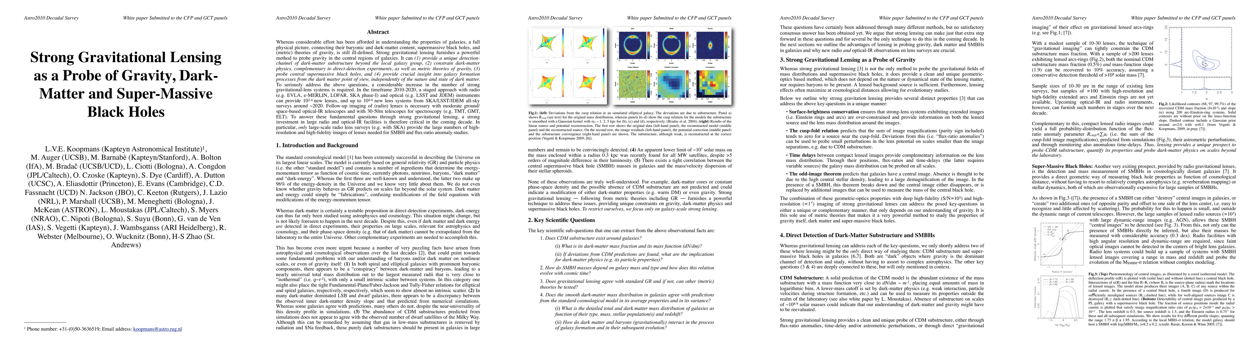 This paper explores the utility of strong gravitational lensing to investigate gravity, dark matter, and supermassive black holes in galaxies. It emphasizes the need for increased observational data from radio and optical surveys to provide insights into the connection between baryonic and dark matter, and to probe the central regions of galaxies.