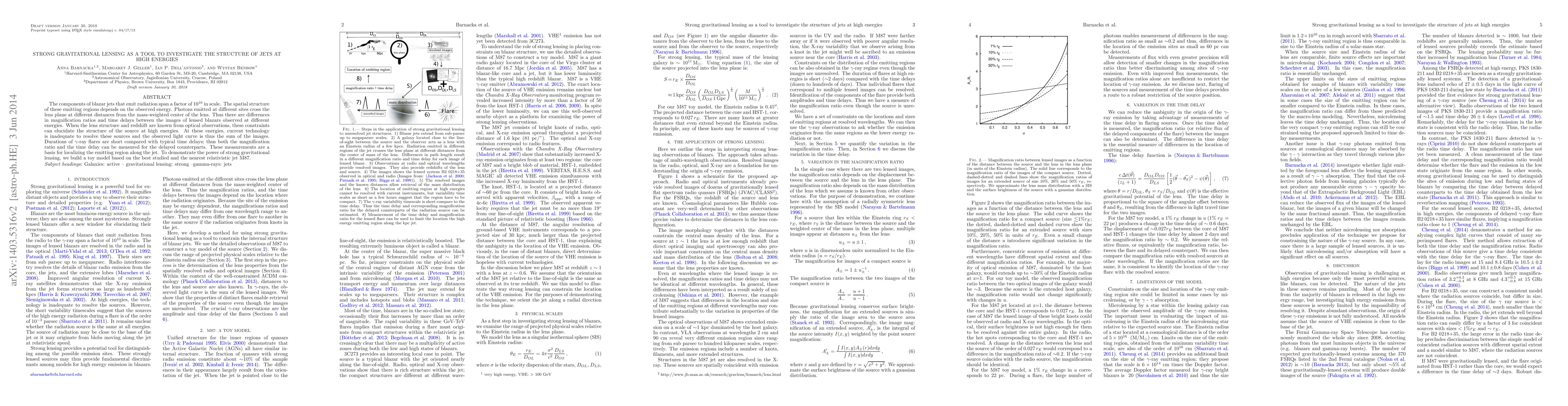 The components of blazar jets that emit radiation span a factor of $10^{10}$ in scale. The spatial structure of these emitting regions depends on the observed energy. Photons emitted at different sites cross the lens plane at different distances from the mass-weighted center of the lens. Thus there are differences in magnification ratios and time delays between the images of lensed blazars observed at different energies. When the lens structure and redshift are known from optical observations, these constraints can elucidate the structure of the source at high energies. At these energies, current technology is inadequate to resolve these sources and the observed light curve is thus the sum of the images. Durations of $\gamma$-ray flares are short compared with typical time delays; thus both the magnification ratio and the time delay can be measured for the delayed counterparts. These measurements are a basis for localizing the emitting region along the jet. To demonstrate the power of strong gravitational lensing, we build a toy model based on the best studied and the nearest relativistic jet M87.