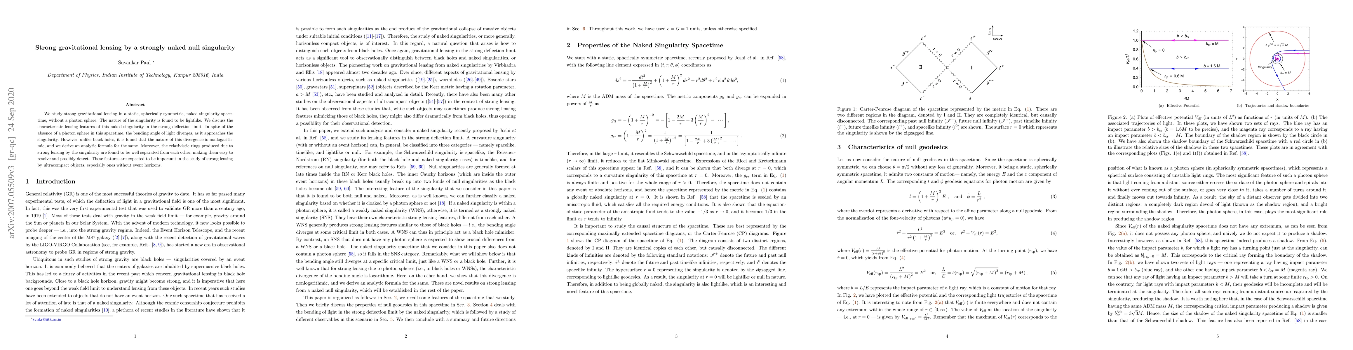 This paper investigates strong gravitational lensing by a naked null singularity, revealing a nonlogarithmic divergence in light bending and well-separated relativistic rings, which could aid in detecting such ultracompact objects without event horizons.