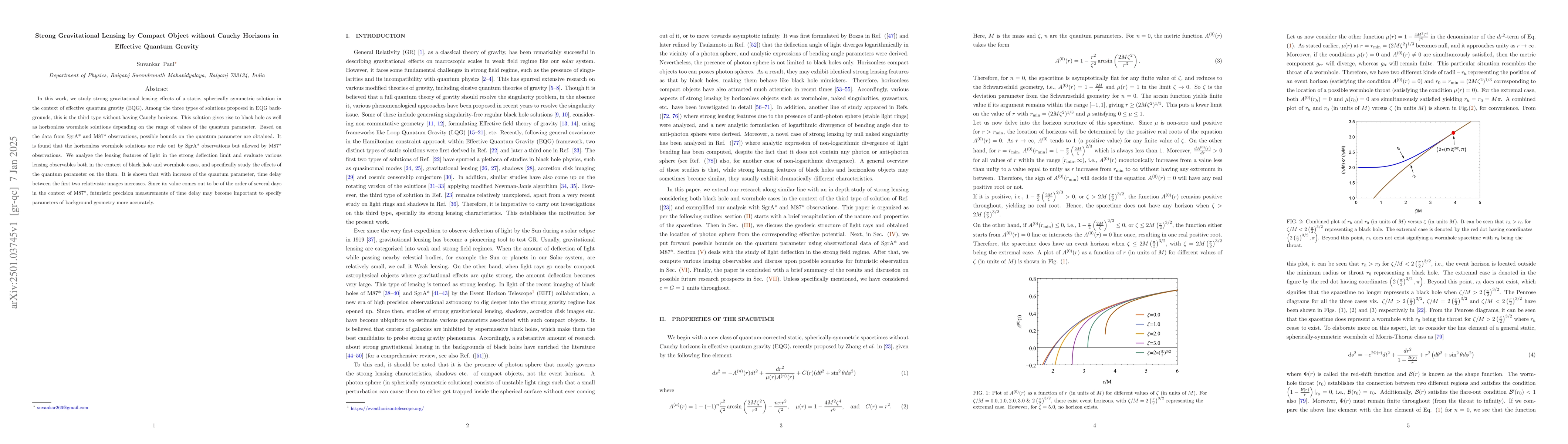 This research examines strong gravitational lensing effects in effective quantum gravity (EQG), focusing on a static, spherically symmetric solution without Cauchy horizons. The study finds horizonless wormhole solutions allowed by M87* observations but ruled out by SgrA* data, with implications for time delay measurements to better define background geometry parameters.